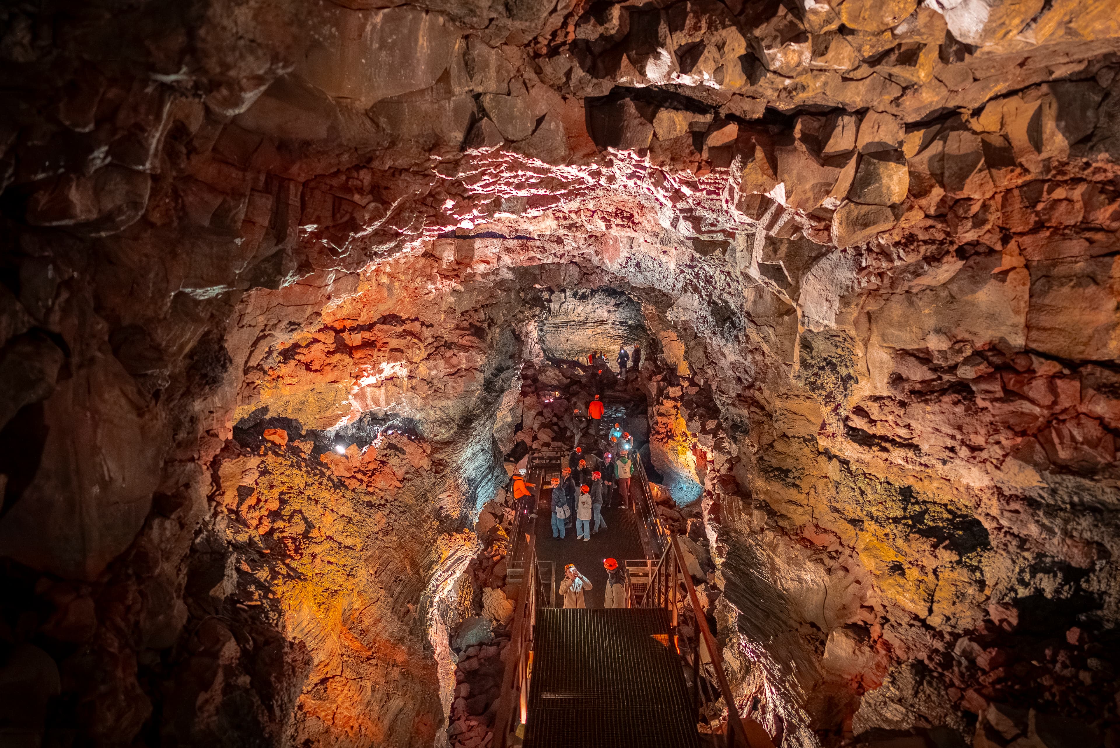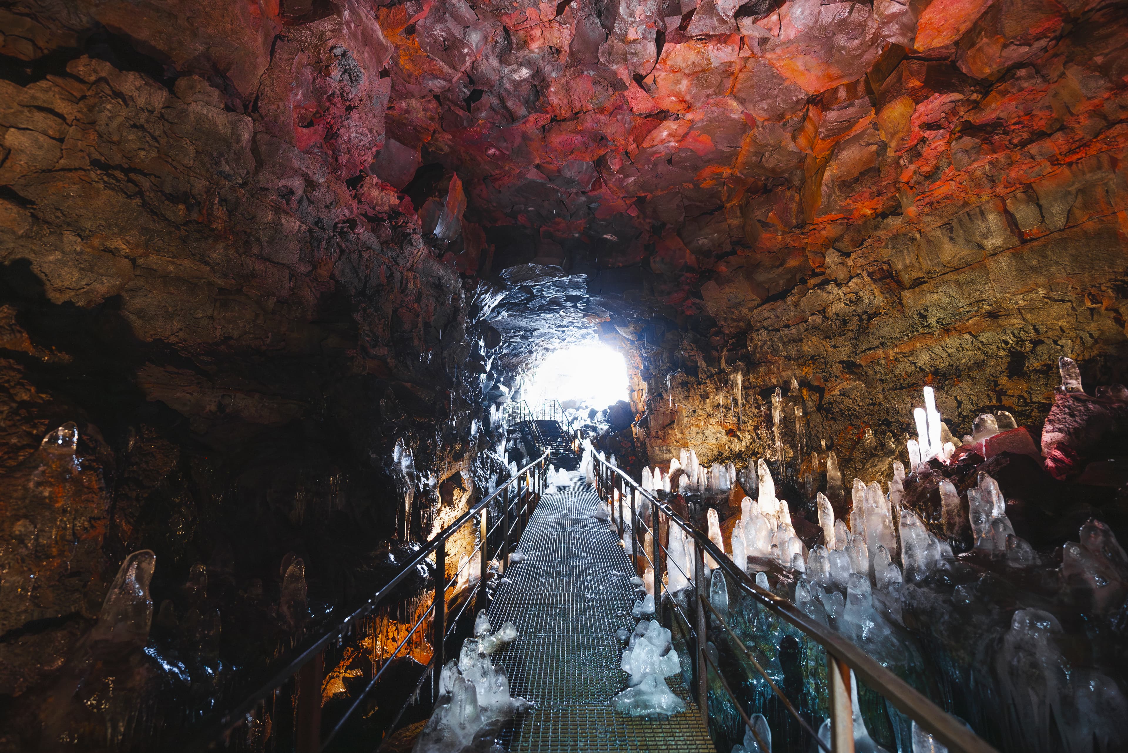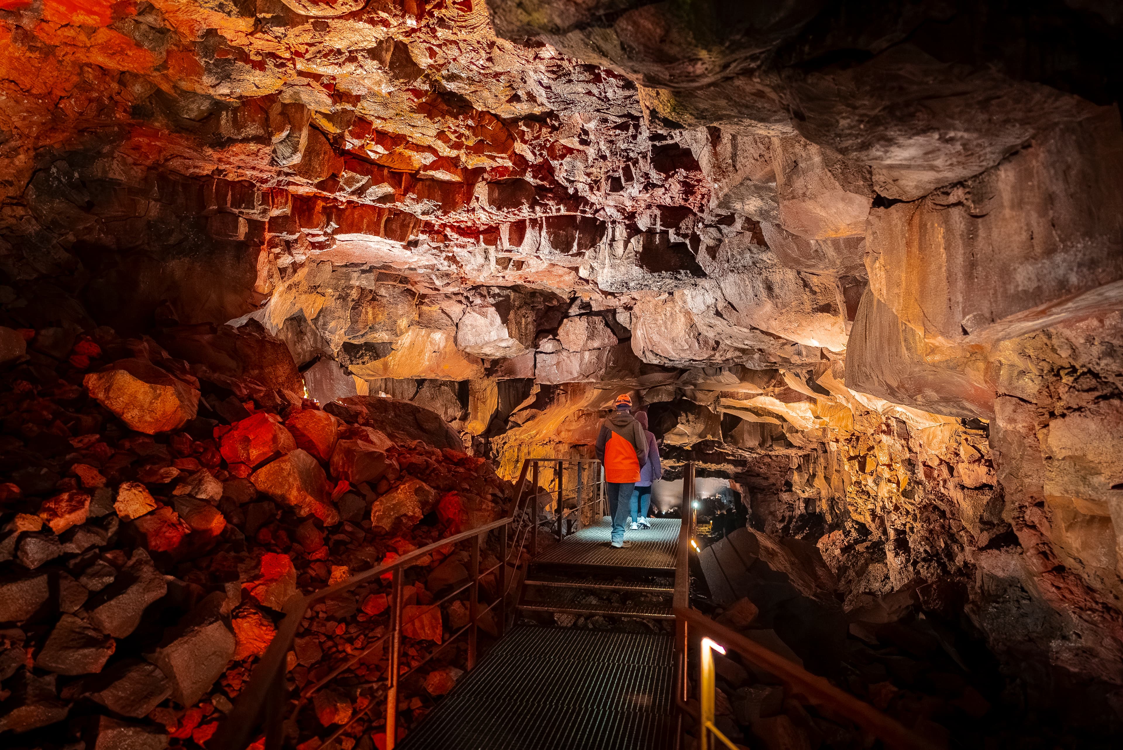 Raufarhólshellir, one of Iceland’s longest lava tubes, stretches 1,360 m and offers a spacious, easy walk through stunning volcanic formations. Enter through a narrow opening and journey deeper into the cave, where naturally colored walls shimmer in red, violet, and turquoise from mineral deposits. Along the way, our expert guides share the cave’s history, highlight its most impressive features, and ensure a safe, unforgettable adventure. The tour lasts for approximately 1 hour. You'll then be dropped back in Reykjavík after the tour for some free time before being picked up again for the section half of the tour.