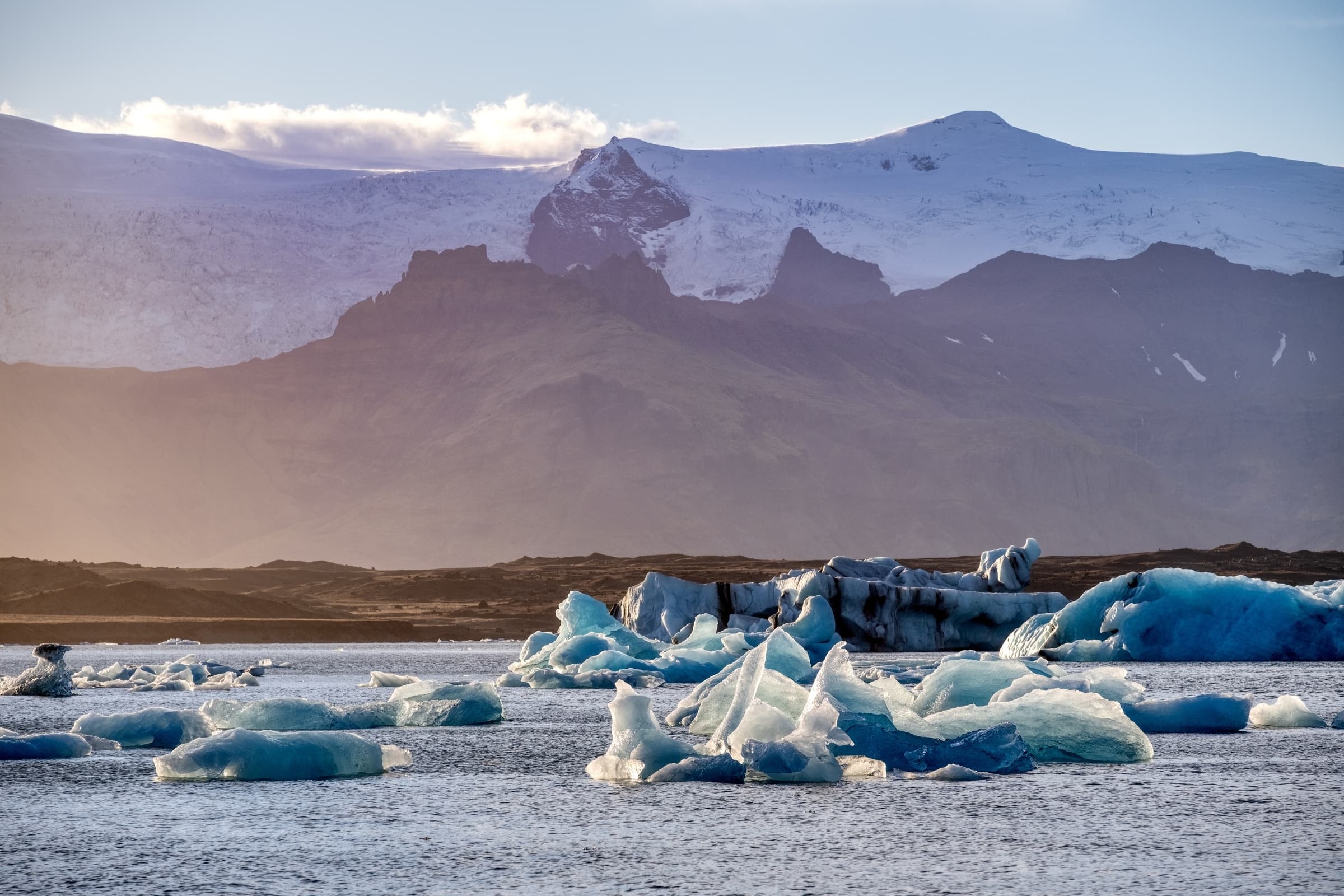A brief stop in the village of Vík gives way to the long drive east toward the centrepiece of the day: Jökulsárlón Glacier Lagoon. Here, icebergs calved from the glacier drift slowly across a deep glacial lake, their surfaces ranging from brilliant white to deep ice blue depending on the light. Just across the road, Diamond Beach is scattered with ice fragments washed ashore onto black sand - one of the most photogenic natural scenes in Iceland.
