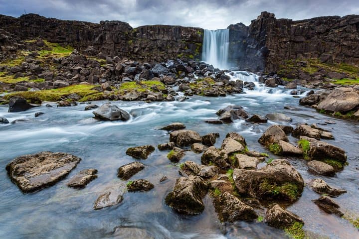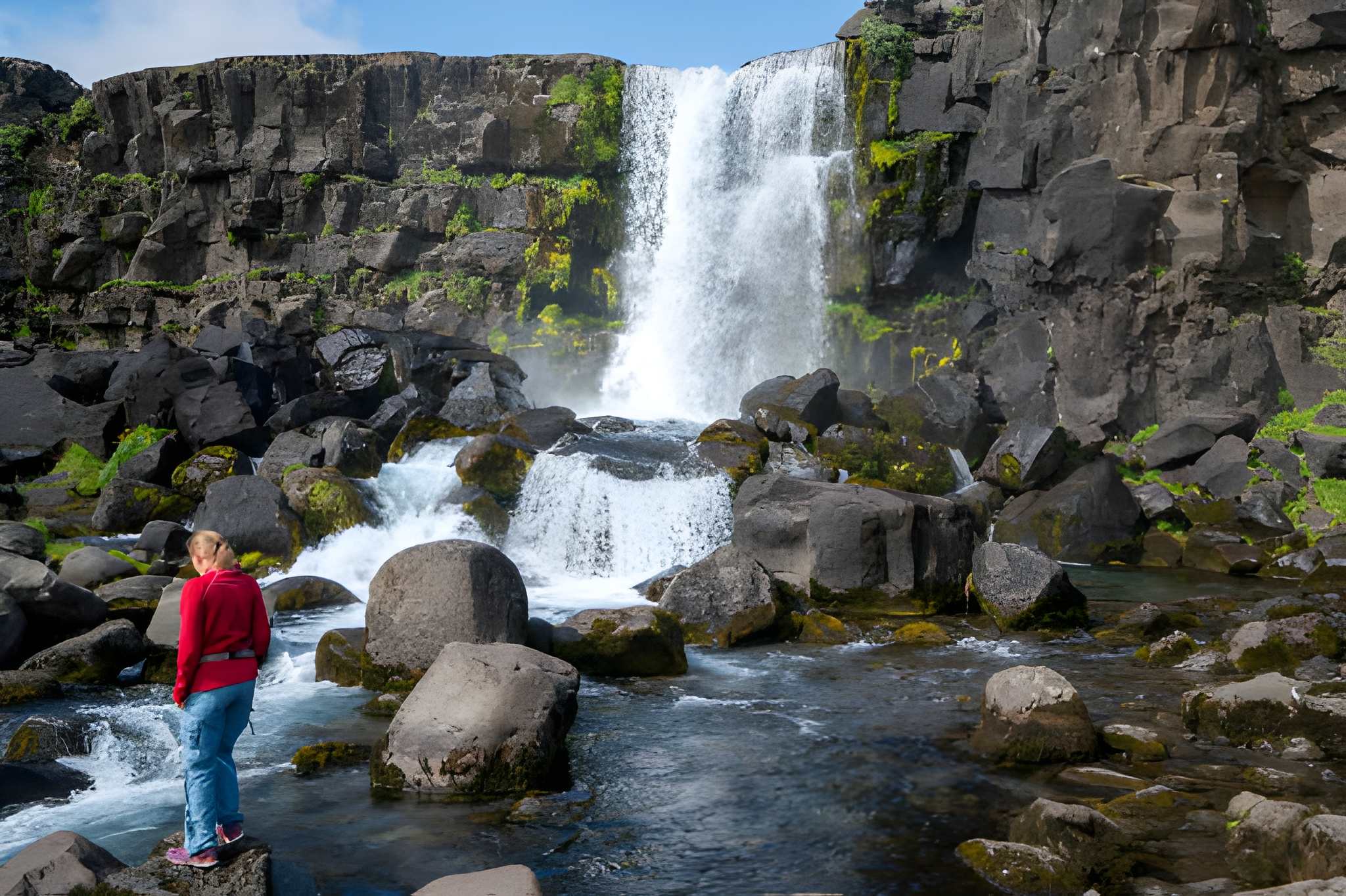 If time allows, you will also stop at Öxarárfoss, a beautiful waterfall inside Þingvellir National Park. The tour continues to Kerið volcanic crater, where you can enjoy views of the colorful crater and the lake below.