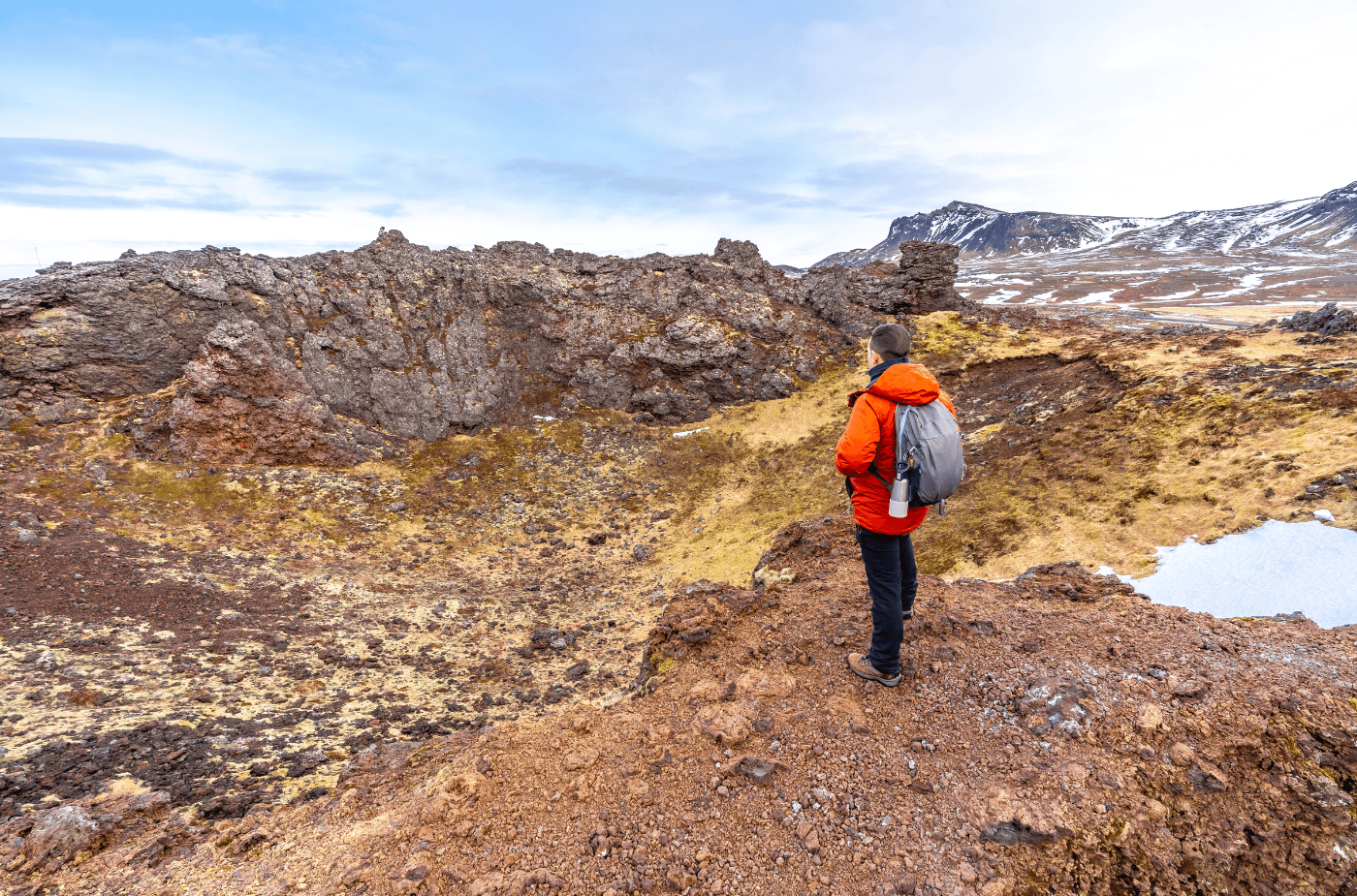 Along the western tip, Djúpalónssandur delivers one of Iceland's most atmospheric beach experiences: black pebbles, towering cliffs, ancient fishermen's lifting stones, and the rusted wreckage of a trawler still lying where it came ashore. The volcanic landscape of Hólahólar - the dramatic crags of the Lóndrangar area rising from the lava fields - and the perfectly formed Saxhóll Crater, climbed via a spiral staircase to a panoramic rim, round out the peninsula's raw volcanic character before the tour heads north.