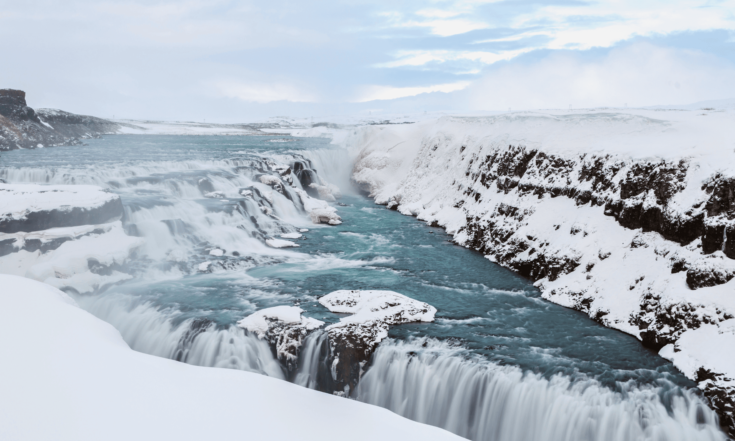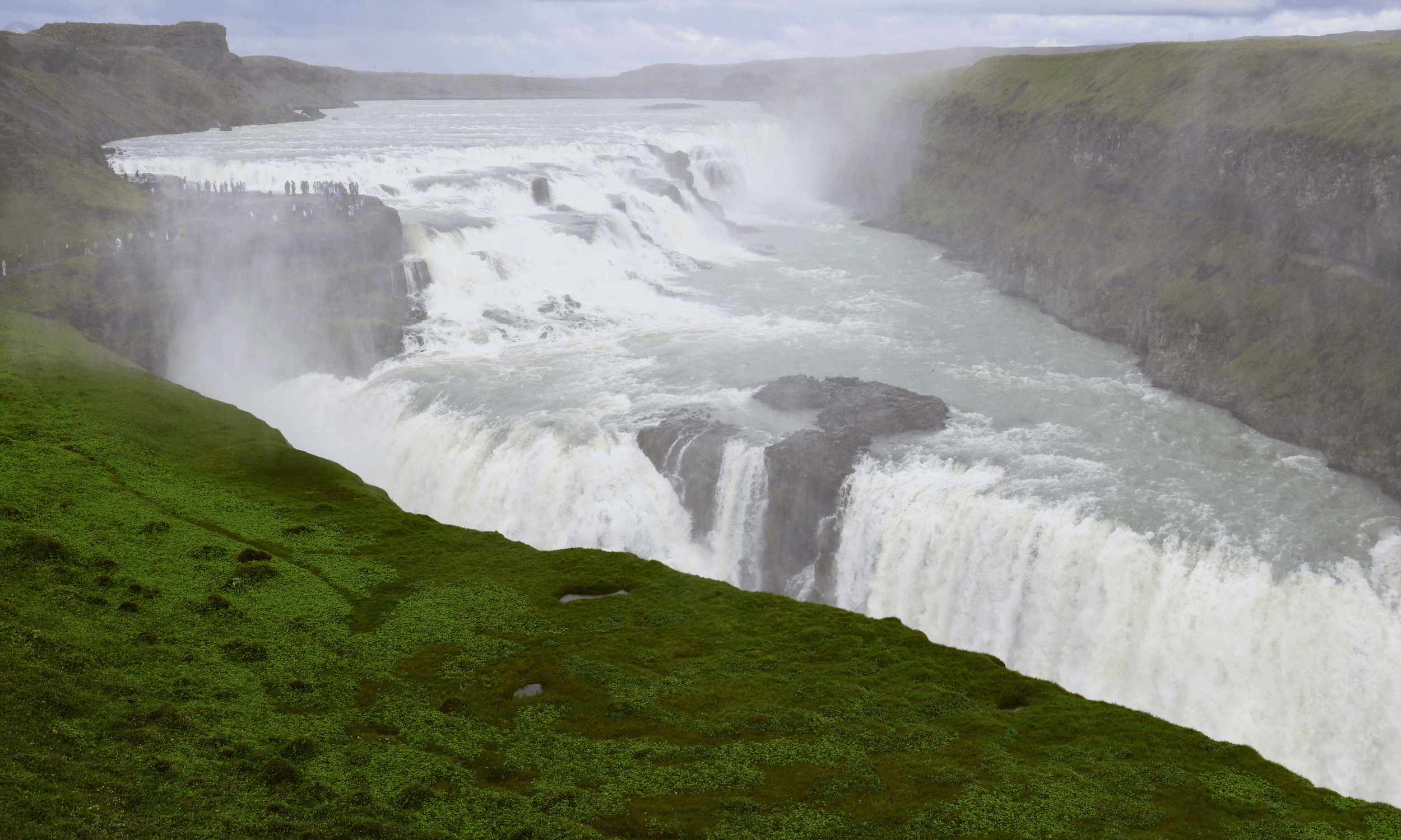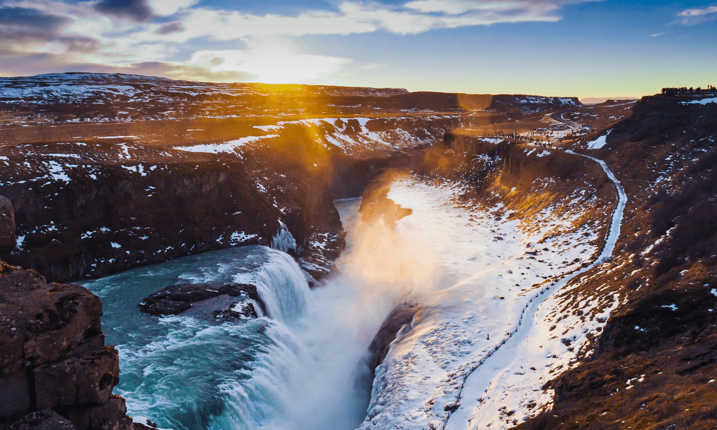 Further along the route, Gullfoss waterfall provides one of the day’s most powerful sights. The water drops in two stages into a deep canyon, often creating mist and rainbows on clear days.