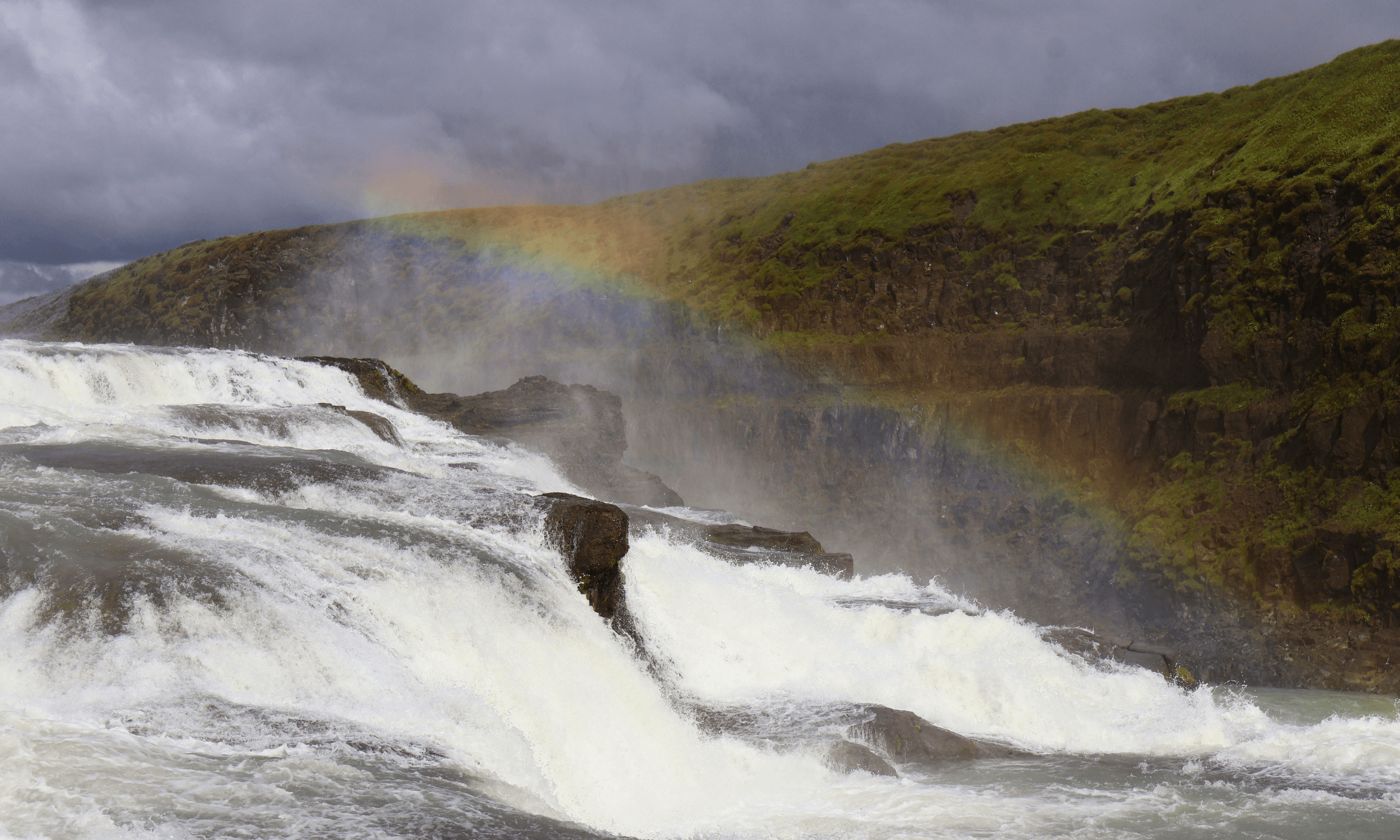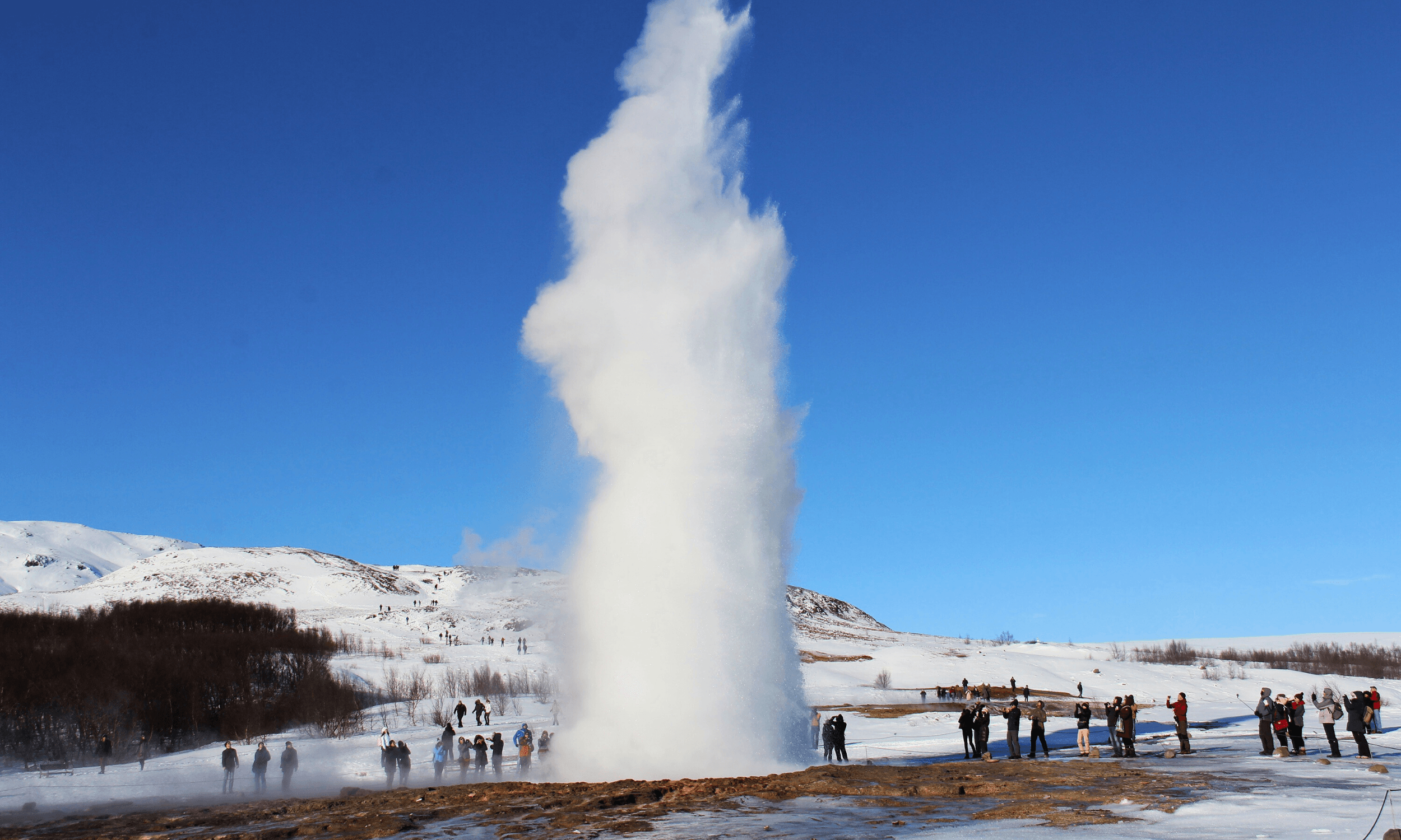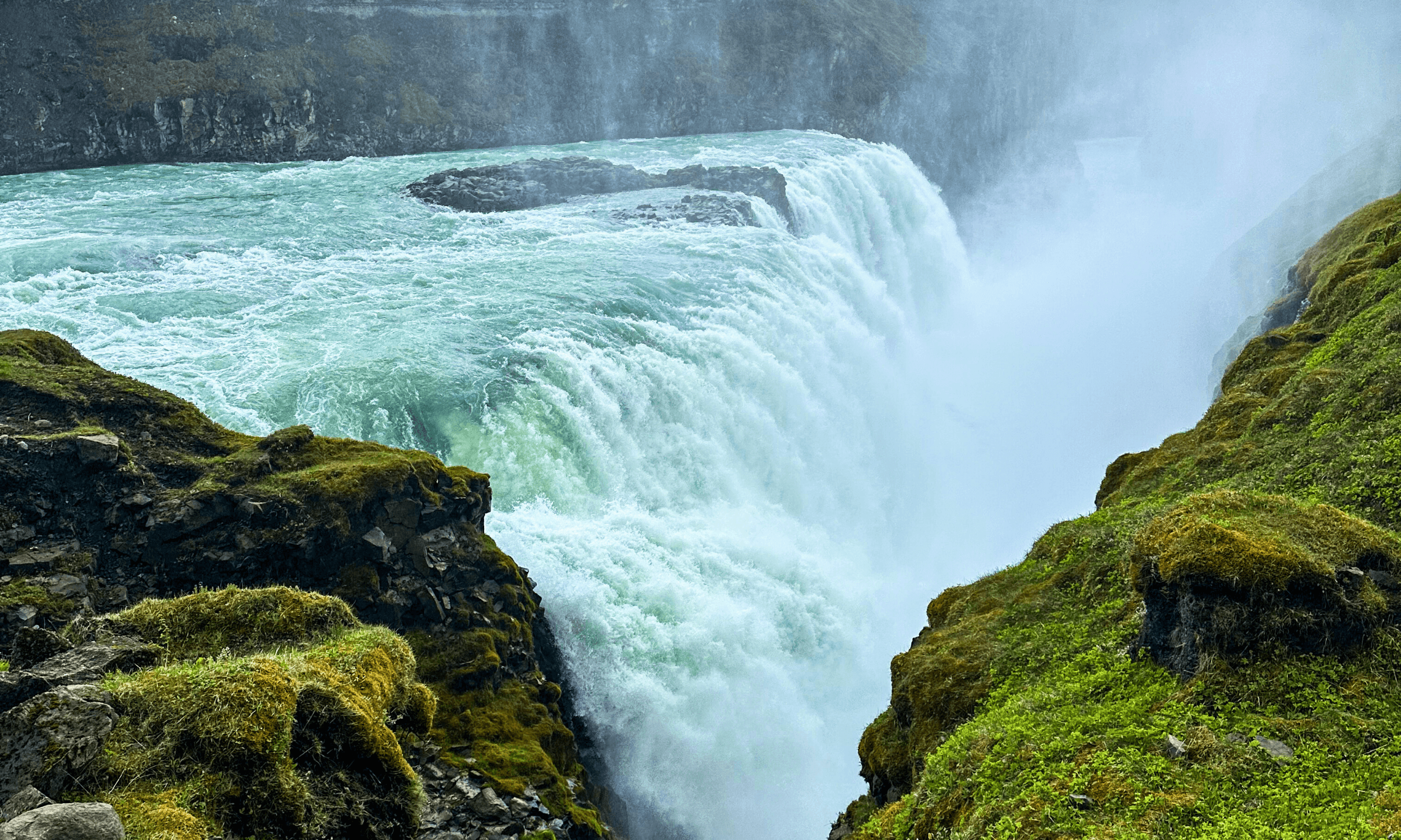 Further along the route, Gullfoss waterfall provides one of the day’s most powerful sights. The water drops in two stages into a deep canyon, often creating mist and rainbows on clear days.