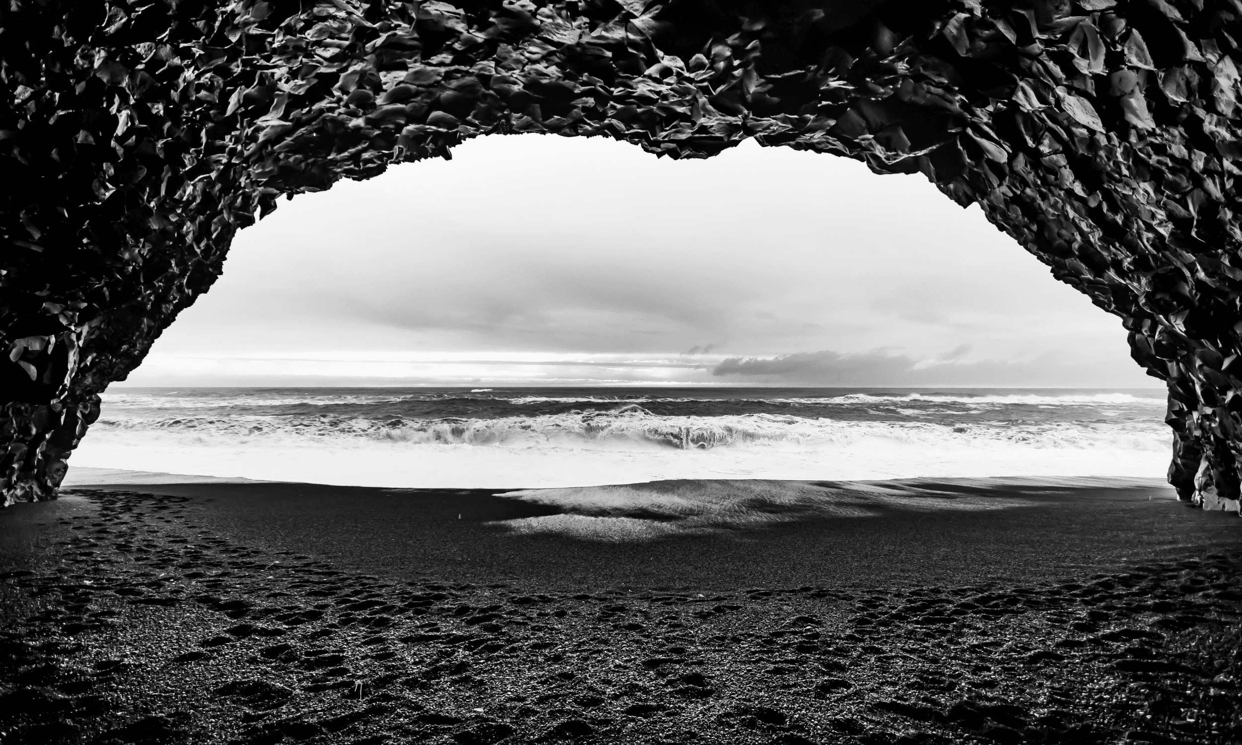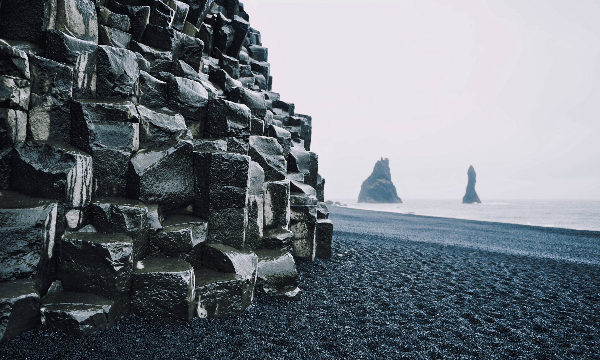 Nearby, Reynisfjara Black Sand Beach offers one of the most distinctive coastal scenes in Iceland. Basalt columns line the cliffs, and strong Atlantic waves break along the shore, with the Reynisdrangar sea stacks rising just offshore.