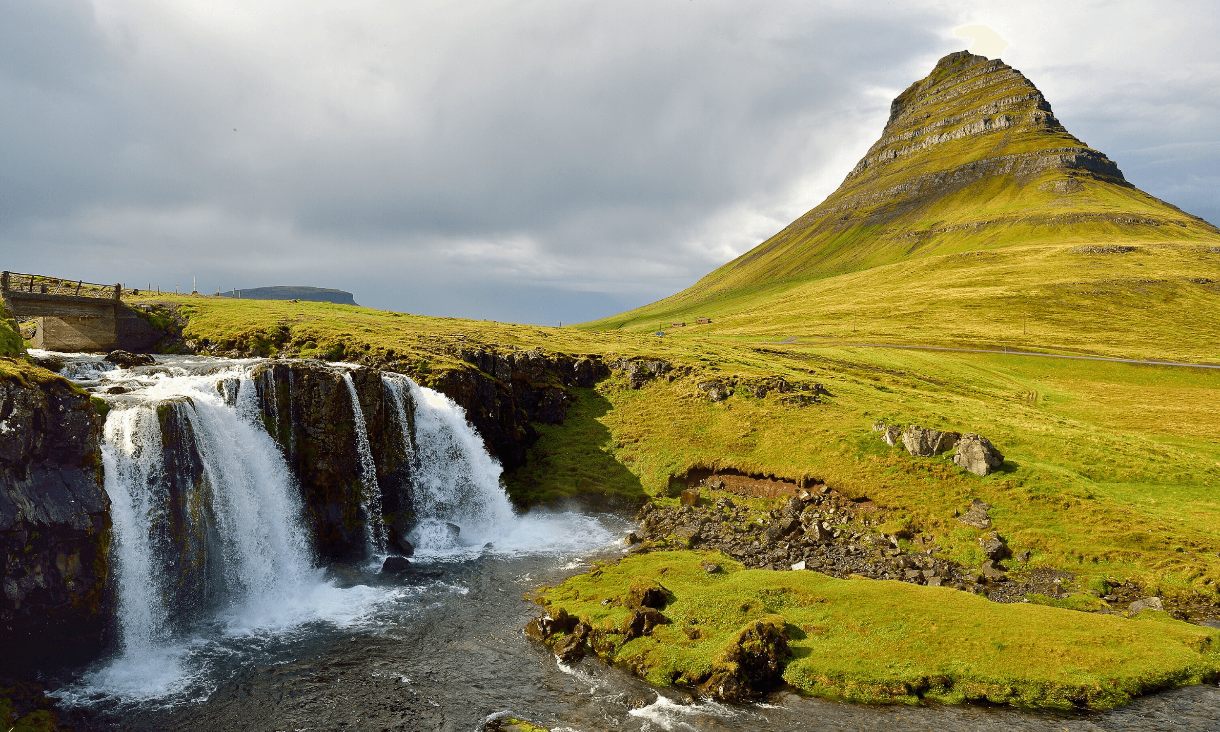 Further north, the route leads to Kirkjufell Mountain and its nearby waterfall. The mountain’s distinct shape rises sharply from the surrounding land, and the waterfall in front creates a well-known composition.