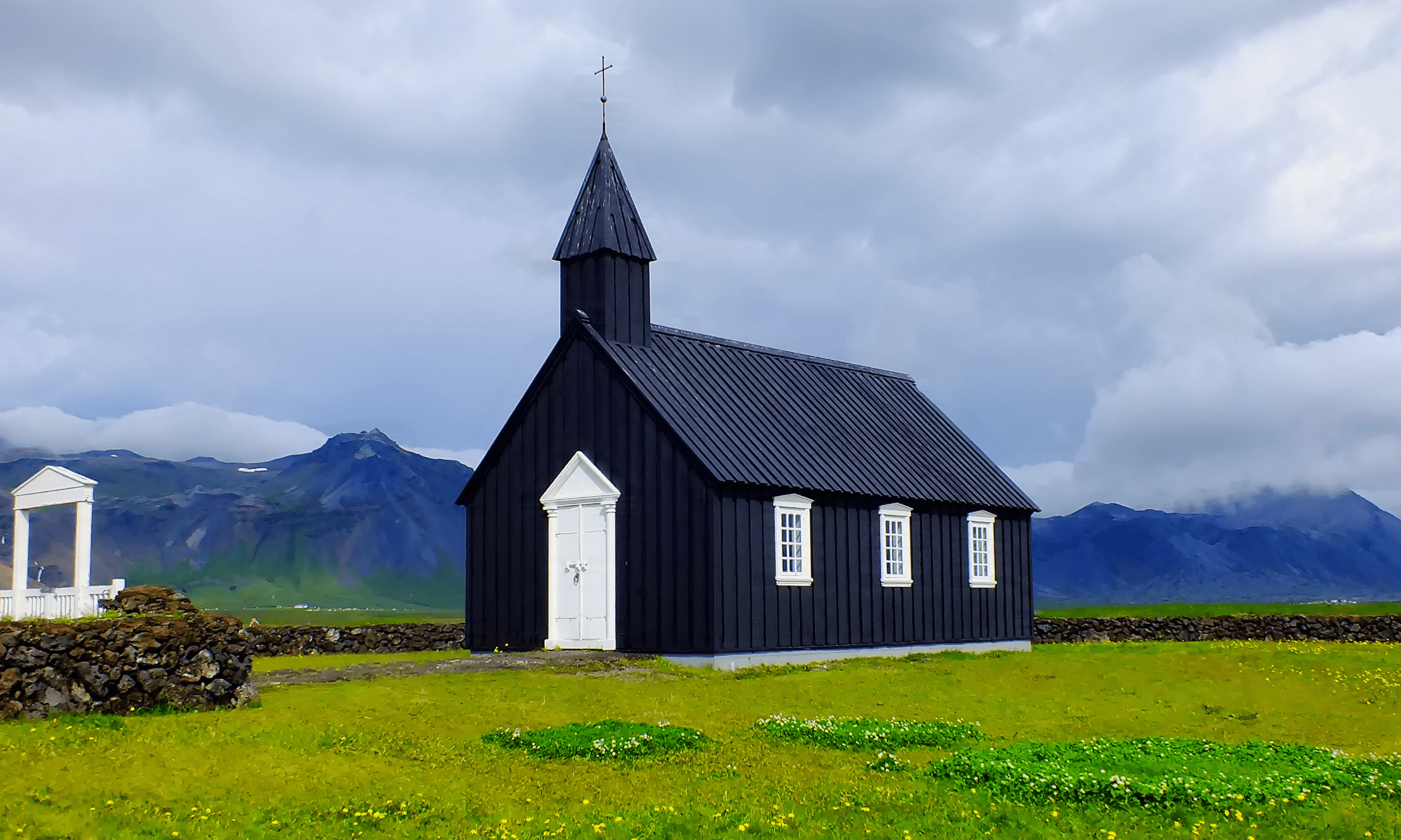 A short drive brings you to Budakirkja, the black church of Budir. Its simple structure stands alone against lava fields and open sea, which creates a strong contrast in both color and setting.