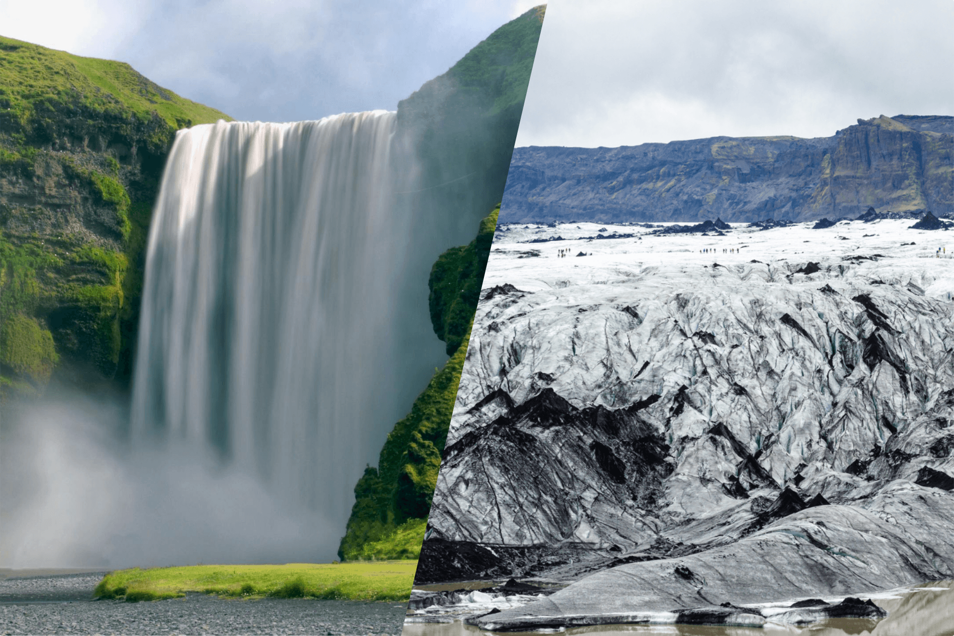 The return west brings you to the waterfall trio: the towering Skógafoss with its climbable staircase, the crowd-pleasing Seljalandsfoss where a path leads behind the falling water, and the secret of the South Coast - Gljúfrabúi, a hidden cascade tucked inside a narrow canyon that most visitors walk straight past.