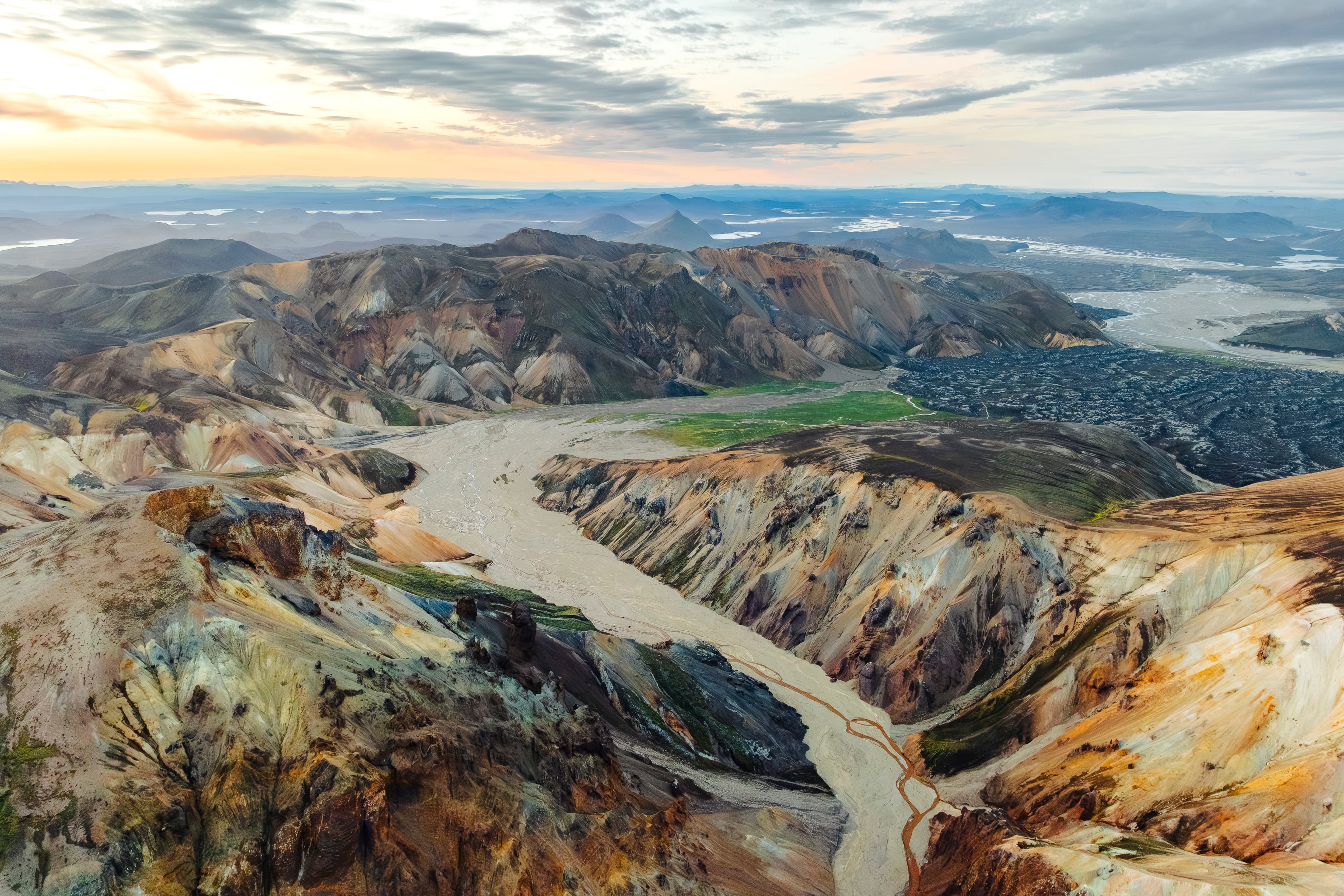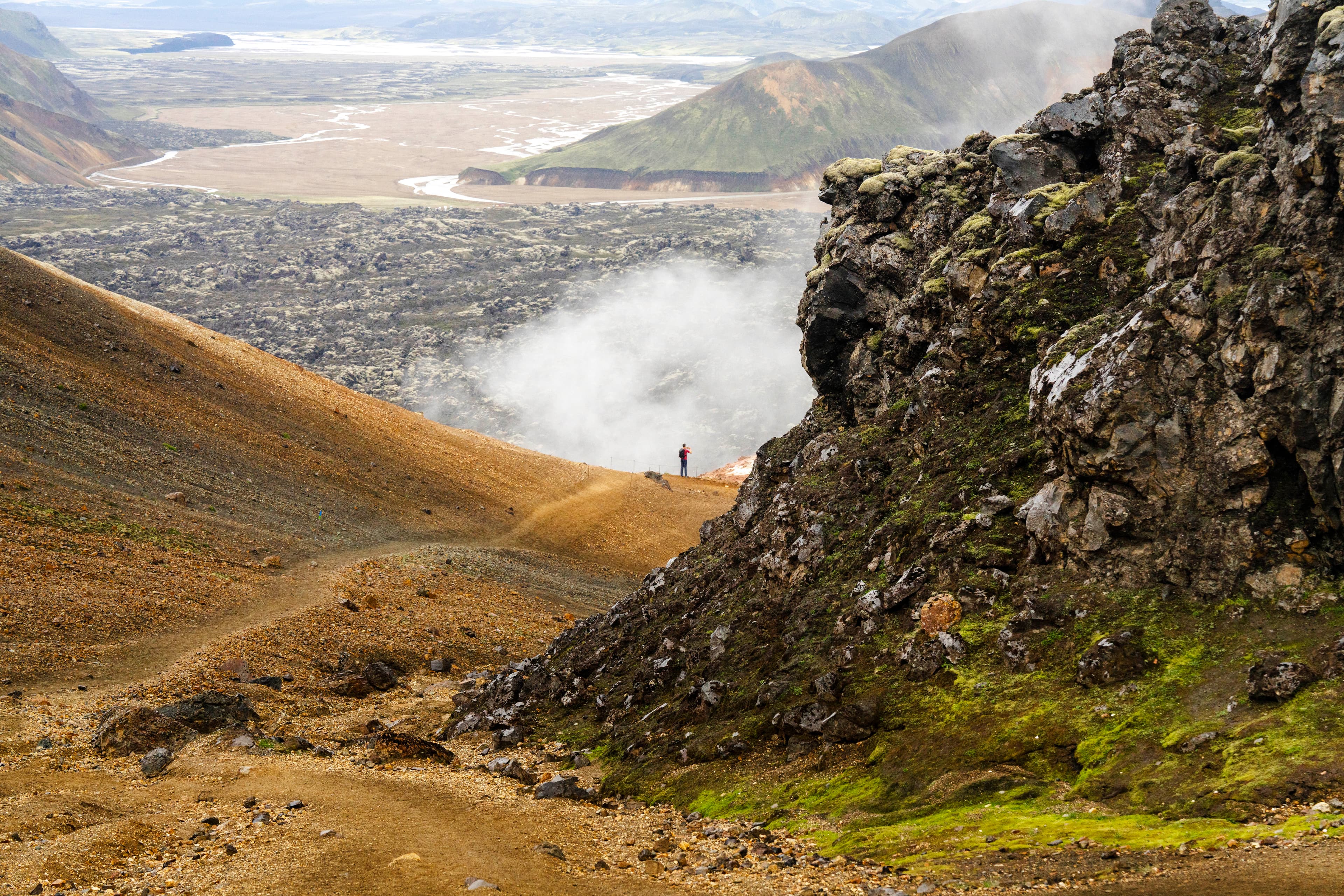 Located in the heart of Iceland’s Highlands, Landmannalaugar marks the beginning of the famous Laugavegur Trail and is home to some of the country’s most breathtaking landscapes. Your hike starts at the Landmannalaugar campsite and follows an easy yet scenic 4‑hour route through extraordinary geothermal terrain. You’ll cross the Laugahraun lava field, explore the Vondugil canyon, and ascend Mt. Brennisteinsalda - known for its striking blend of red, green, yellow, and black slopes. The trail continues down into Grænagil, or the “Green Gorge,” named for the vivid green rhyolite that colors the valley walls.