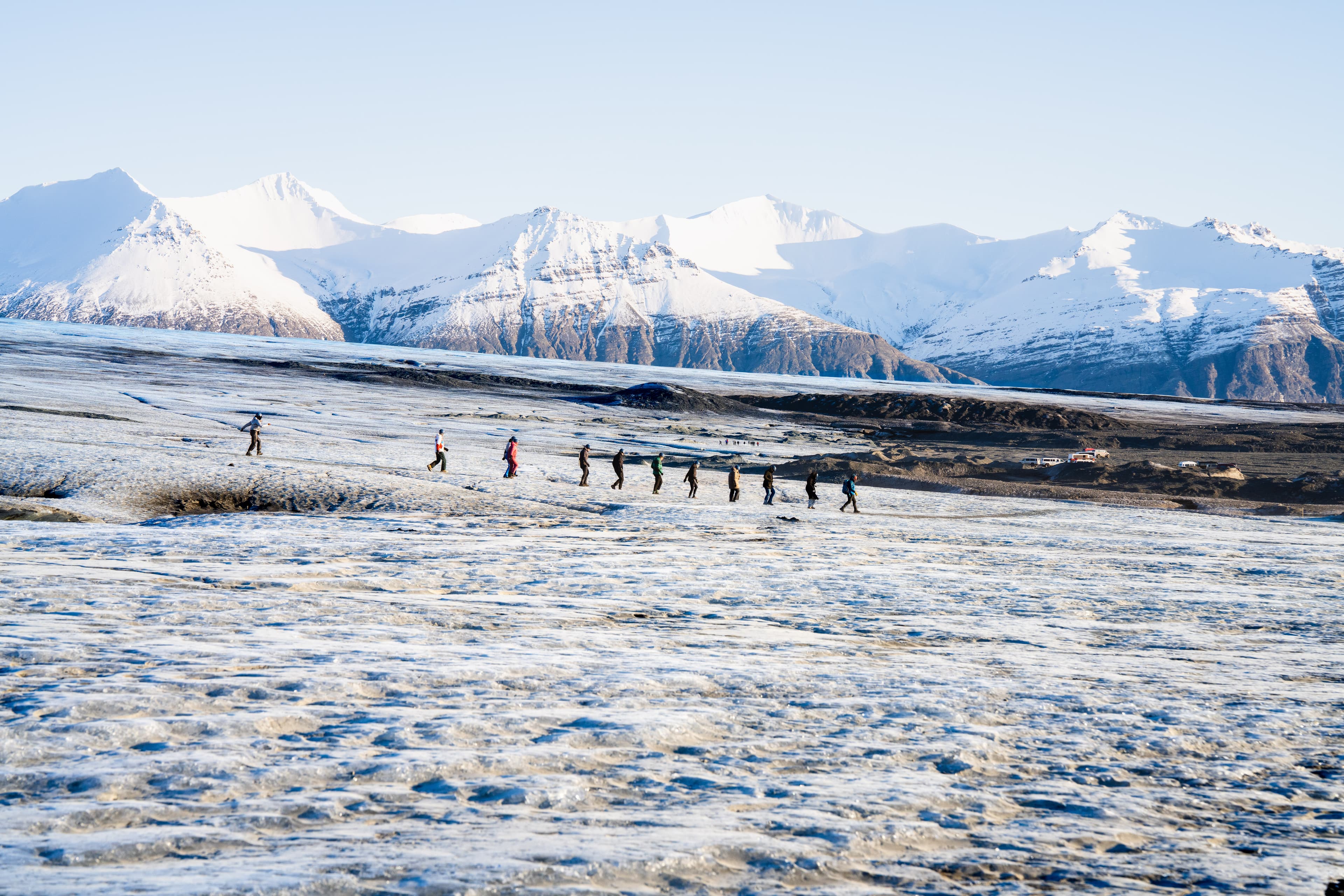 From Jökulsárlón, board a specially modified Super Jeep for a scenic, off-road ride (~30 minutes) to the glacier’s edge. From there, take a short walk of around 15 minutes each way over uneven ground. Your certified glacier guide provides a safety briefing and all necessary glacier gear (helmet, headlamp, crampons) and leads you safely along the glacier.