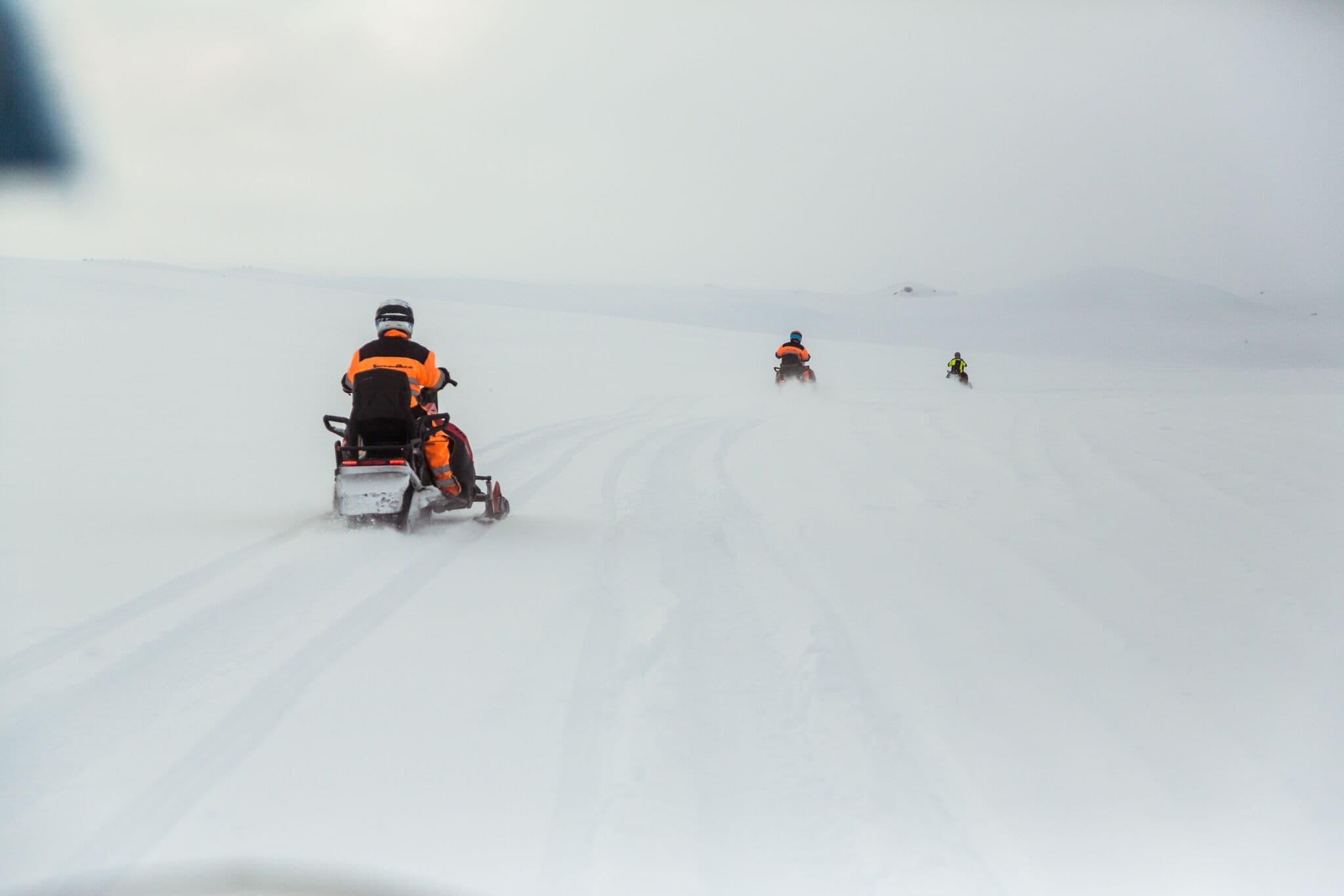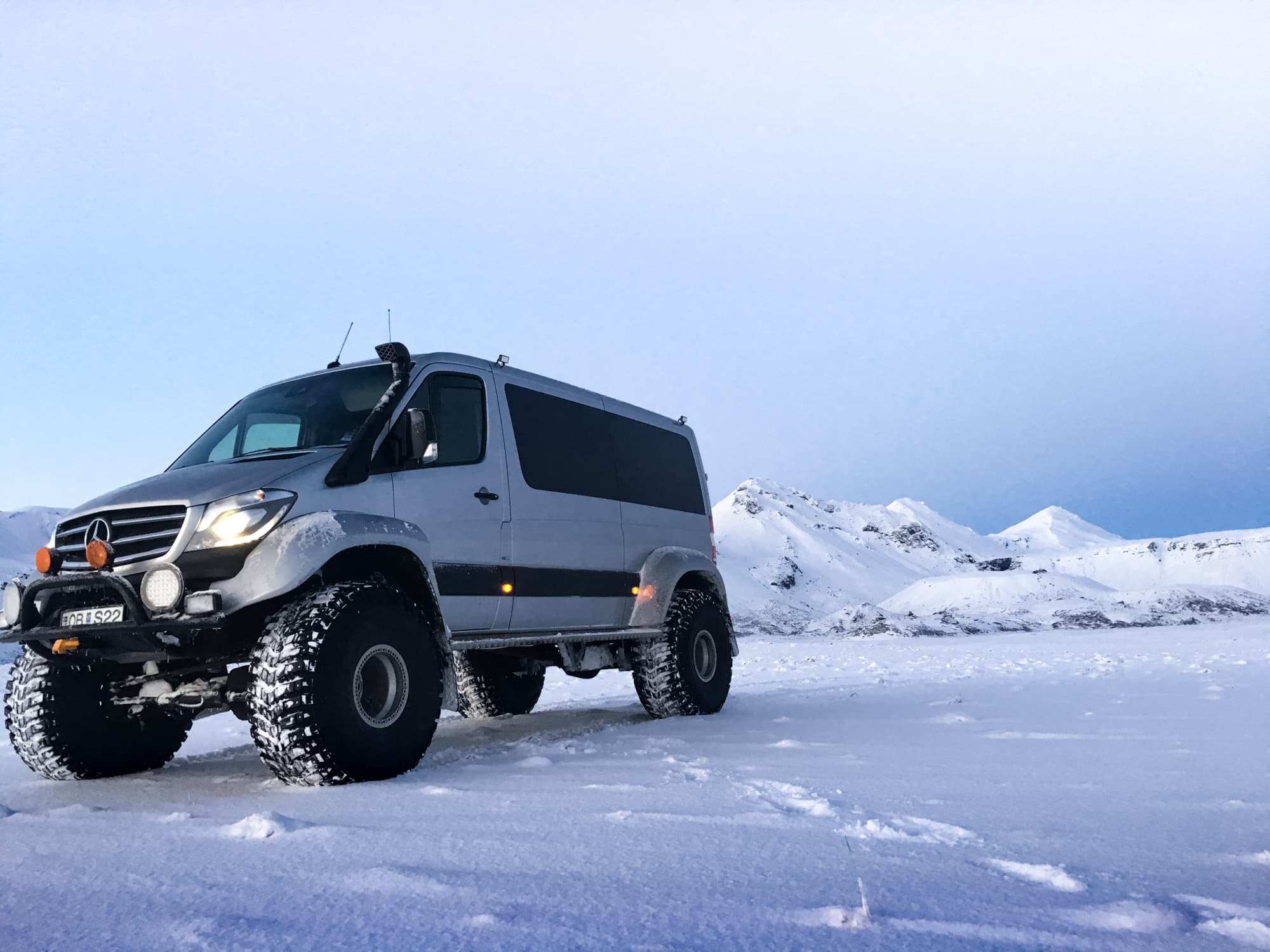 We start the day by picking you up in a super truck at Skjól Campground. From there we will head towards our snowmobile base which is located at the roots of Langjökull glacier, the second largest glacier in Iceland. There you will get all the equipment that you need for the snowmobile ride. After a short safety briefing and a lesson on how to operate the snowmobile we head out on a one hour exhilarating snowmobile ride. When we are halfway through the ride, we will make a stop to explore a magical ice cave on the glacier. There you will also get the opportunity to changes drivers before heading back to our base.