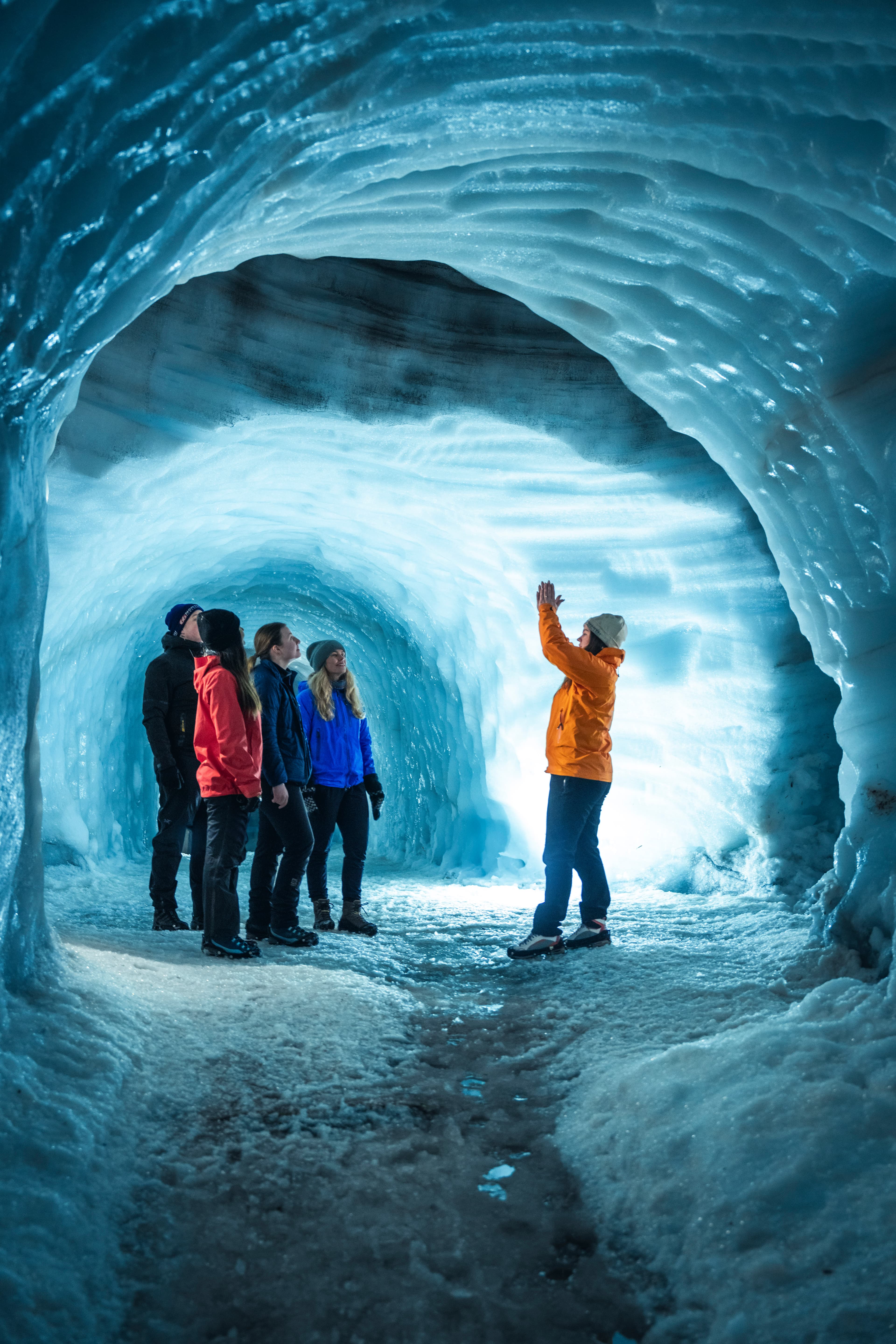 The drive to Langjokull glacier is very scenic and on the way we make a stop by Hraunfossar waterfalls. “Hraun” in Icelandic means lava and the lava at Hraunfossar waterfalls actually came from one of Langjokul glacier’s volcanic eruptions ages ago. At Langjokull glacier’s edge, special modified glacier vehicles will take care of the ride up to the glacier and to the ice caves – and what a ride it is! On the giant glacier itself you will have time to enjoy the stunning environment and view. The walk INTO the glacier itself takes around one hour and is operated with highly experienced English-speaking guides.