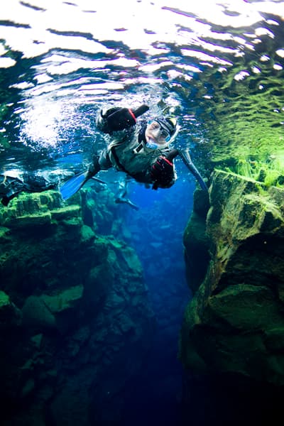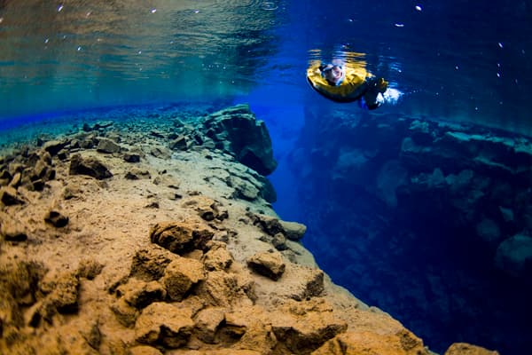 Next, we drive you to Thingvellir National Park. The Silfra fissure is one of Iceland’s otherworldly scenes that is world famous for its heavenly shades of blue. You will snorkel between two tectonic plates through crystal clear glacial waters. Experience the clearest waters in the world! The glacial water originates from Langjökull (Long Glacier) and is naturally filtered through lava fields, resulting in some of the purest water on Earth,with an incredible visibility of up to 150 meters.