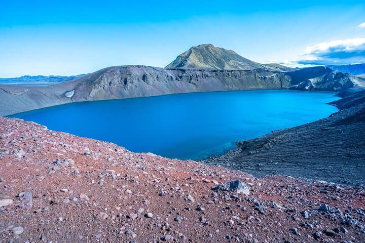 Hnausapollur Crater Hnausapollur is a huge crater on our way from Landmannalaugar. The view over the crater is exceptionally beautiful with high contrast, red lava and the blue lake, makes this stop really wonderful.