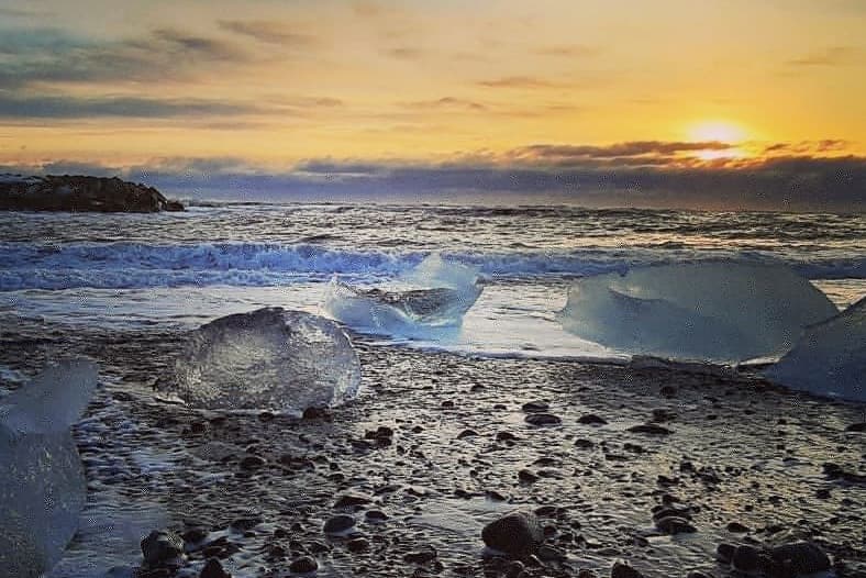 The Black Dimond Beach Jökulsárlón is full of icebergs that melt slowly and travel down the river to the ocean. The strong current of the Atlantic Ocean throws the icebergs back to land where they are stranded on the black beach. This beach has earned the nickname Black Dimond Beach. It is a great experience to walk on the beach between the icebergs and enjoy. The sculpture of the ice is varied and you can find endless photo opportunities.