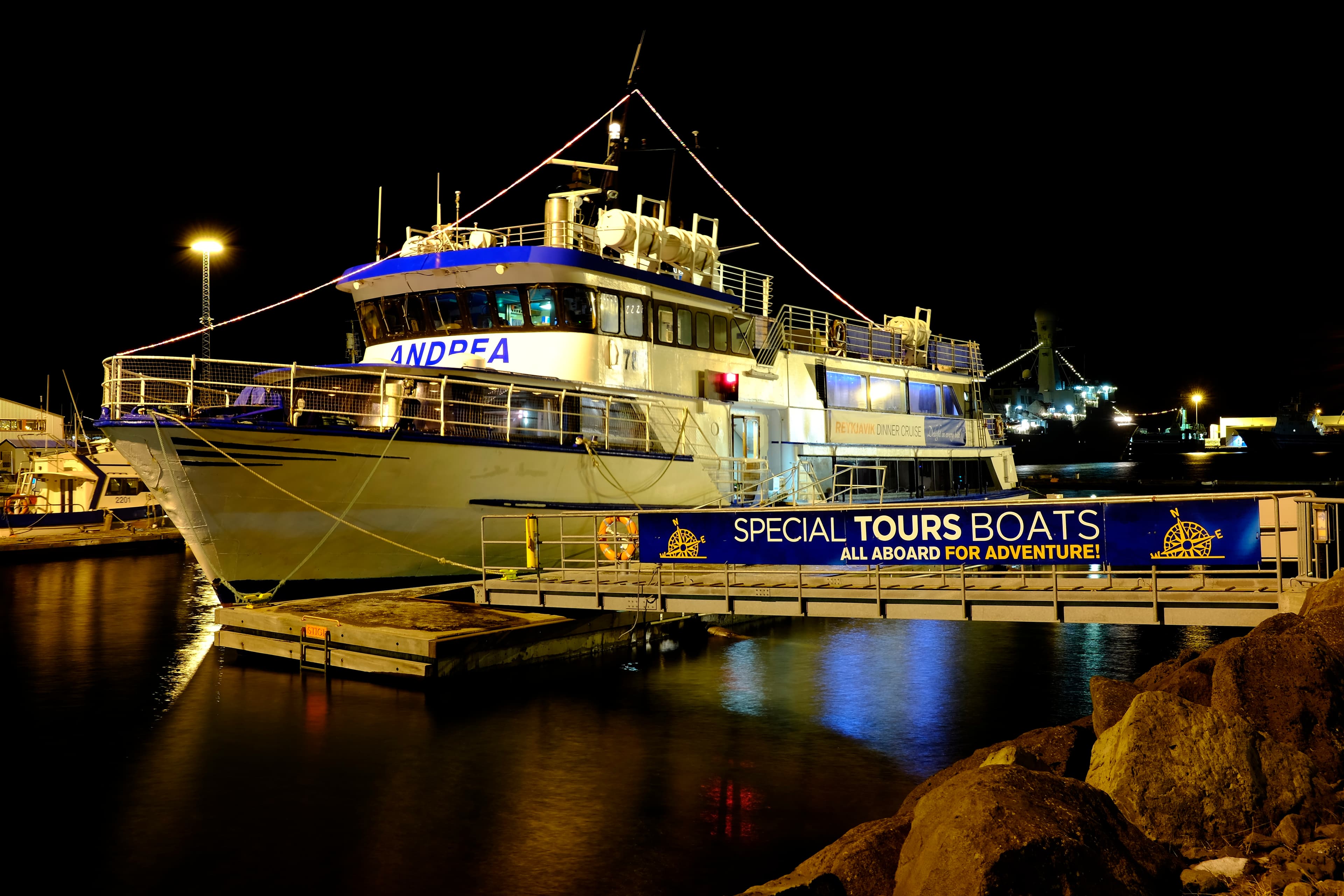 You can chose from a spot in our cozy indoor saloon or stay on our open-air deck. Then, enjoy the views over the glittering lights of Iceland's capital as your boat cruises out into Faxaflói Bay. After the tour you are dropped off in the heart of city so you can continue enjoying the night in Reykjavík.