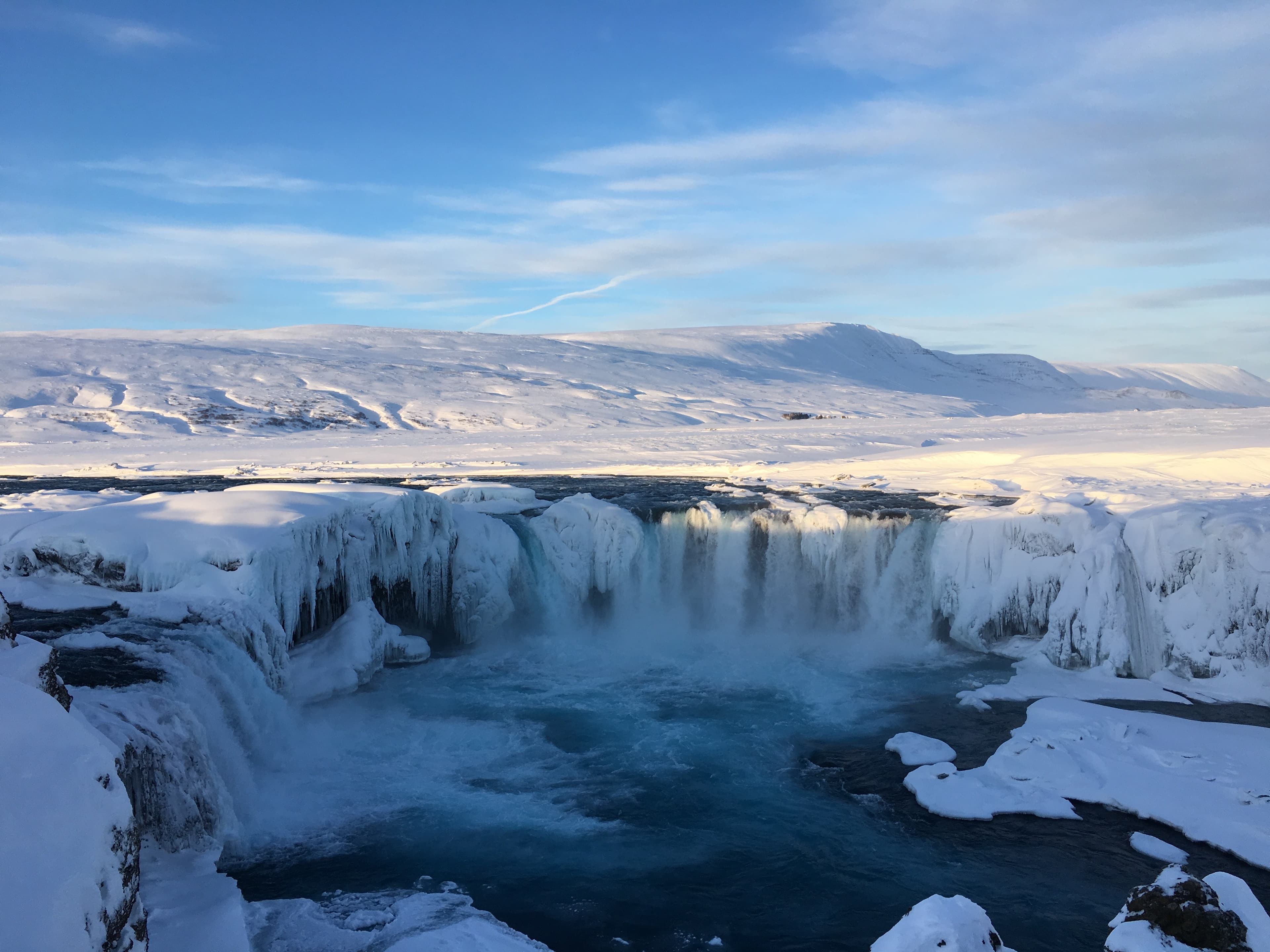 First, we drive along the coast of Eyjafjörður, one of the longest fjords in Iceland. We begin by stopping at Goðafoss waterfall, one of the most spectacular waterfalls in Iceland, on our way to Lake Mývatn, the lake was created by a large basaltic lava eruption 2300 years ago, and the surrounding landscape is dominated by volcanic landforms, including lava pillars and rootless vents.
