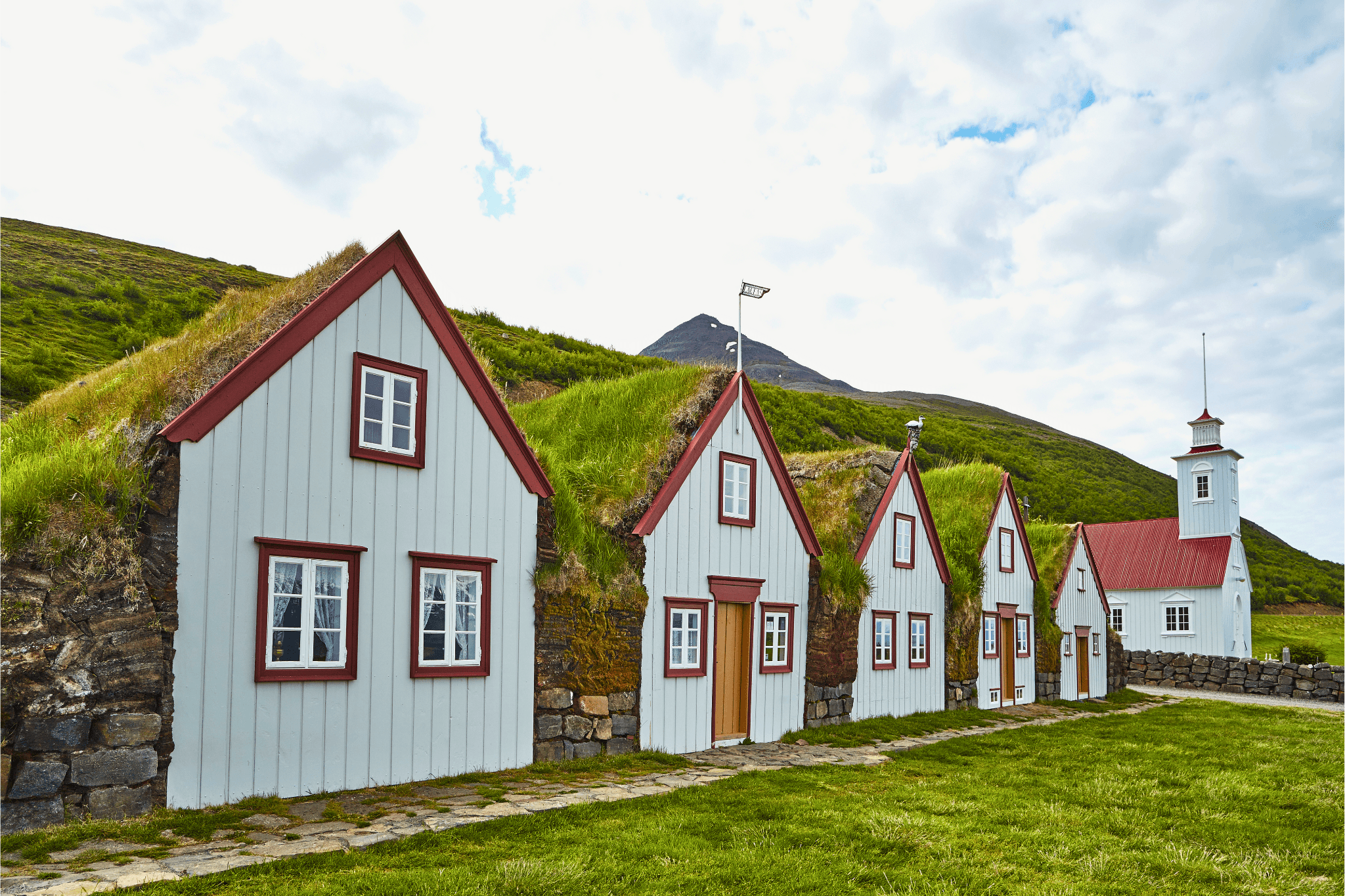 Laufás in Eyjafjörður is located by the estuary of the river Fnjóská. The old farm is a good example of a wealthy vicarage in earlier times. The house that is a turf-clad timber building, has a history that goes right back to the Middle-Ages. It has been rebuilt regularly through the centuries whenever needed. The house that stands now was built between 1860 - 1877. It was then rebuilt in the form we see today. The house is mostly timber frame structure, but part of the tunnels are built with stave construction and the oldest part of the house - The Bridal Room is a combination of both methods.