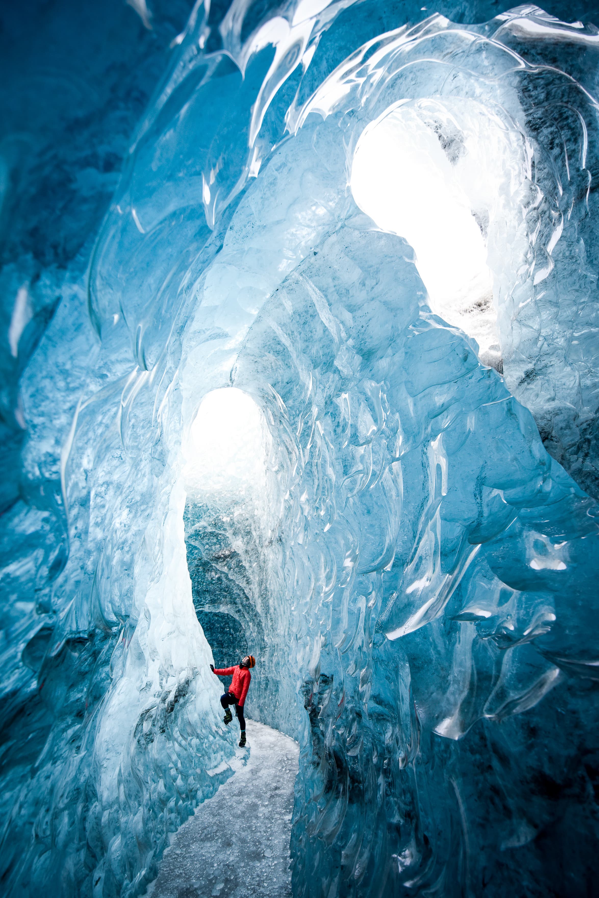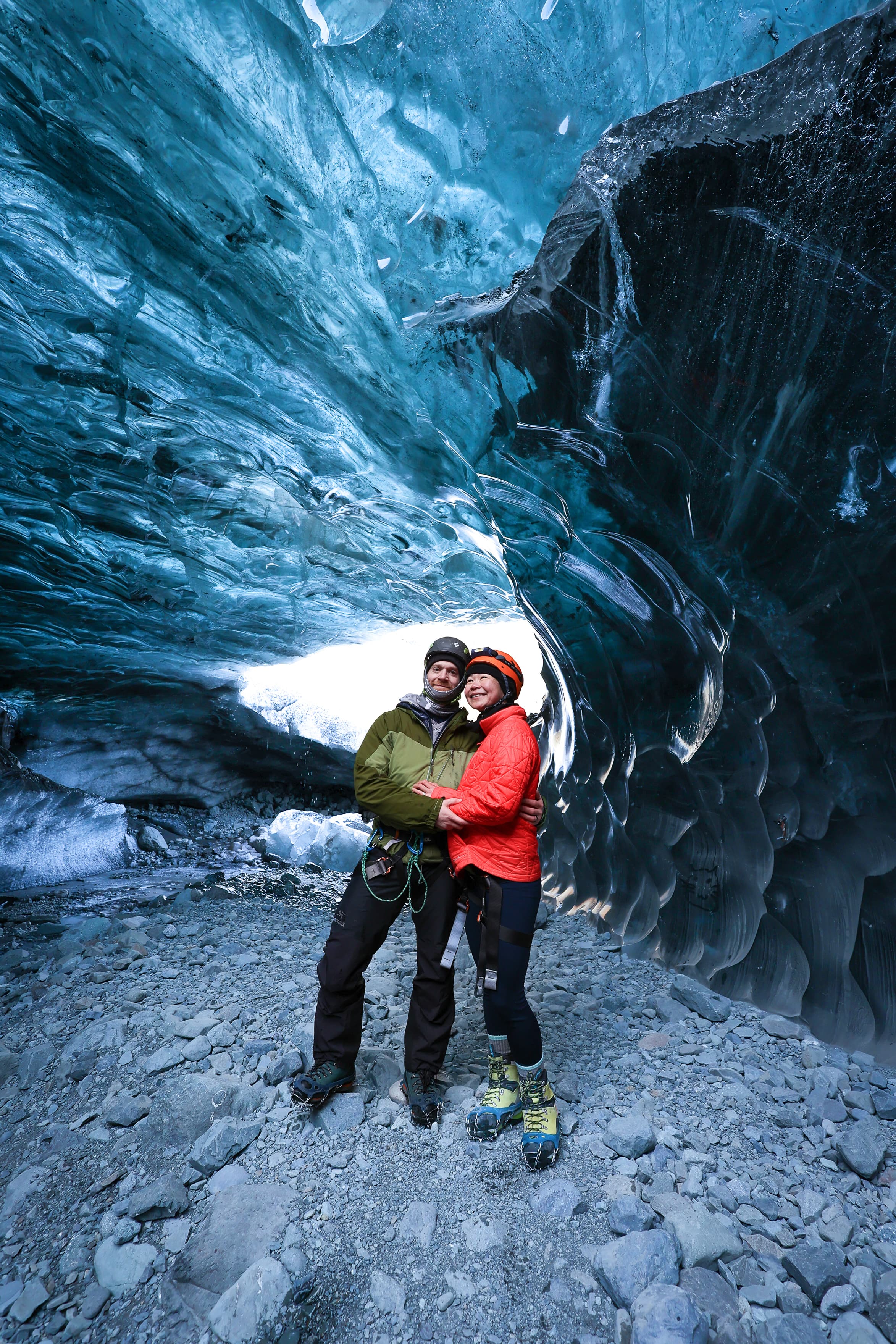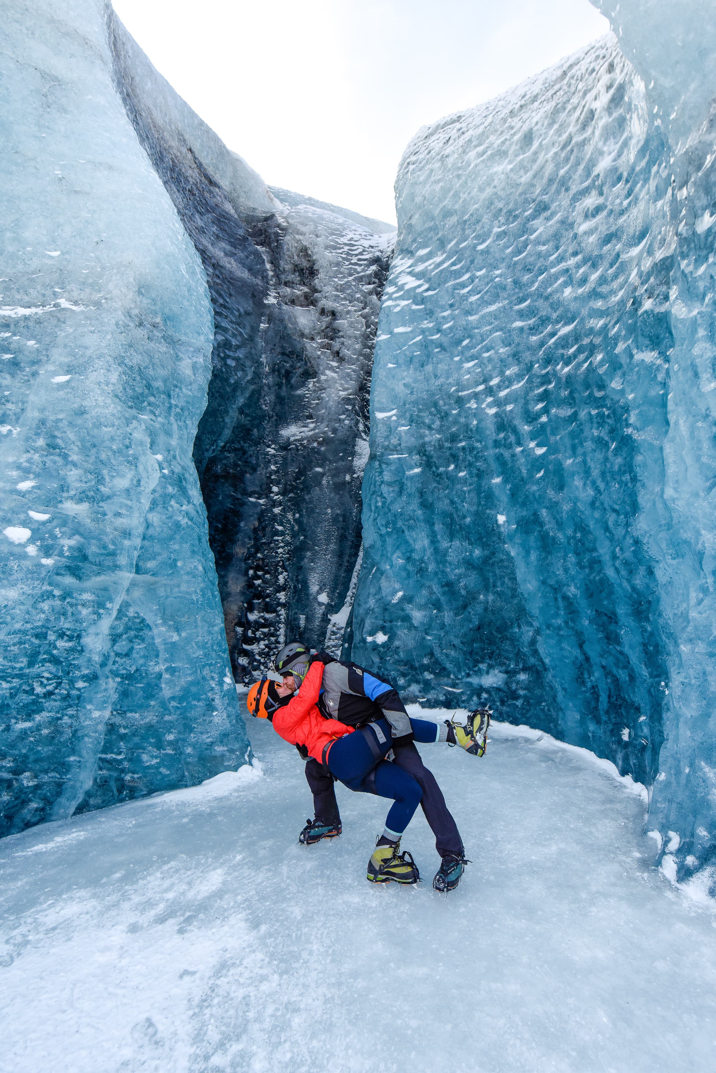 Once through the lower cave, we will gear up for our hike on the glacier. With crampons on, we will hike to many different formations on the glacier including our famous crystal crevasses. The visuals you will see all around you will create an unimaginable experience as your photographer captures you amongst it. This tour involves approximately 5 to 6 km of hiking in total and is considered to require a moderate level of fitness.