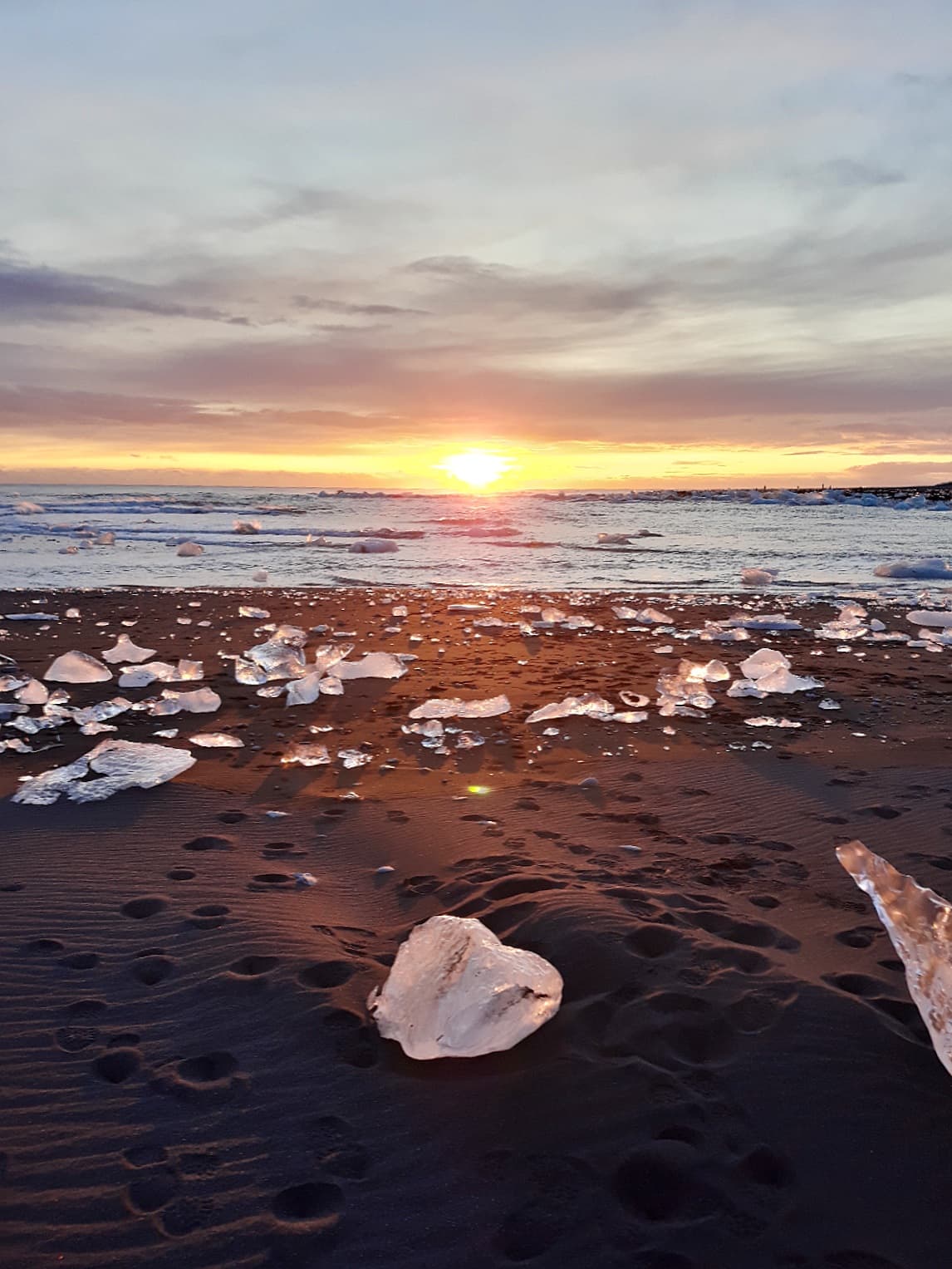After the ice cave adventure, enjoy a delicious lunch in Vík before driving to the stunning Fjaðrárgljúfur canyon. Walk along the canyon rim and be captivated by the sheer scale and beauty of this geological marvel. Continuing eastward, you'll arrive at Jökulsárlón, a glacial lagoon filled with massive icebergs. Take a boat tour or simply enjoy the mesmerizing sight of icebergs floating in crystal-clear waters. Don't miss the nearby Diamond Beach, where ice chunks from the lagoon wash up on the black sand, creating a magical contrast.