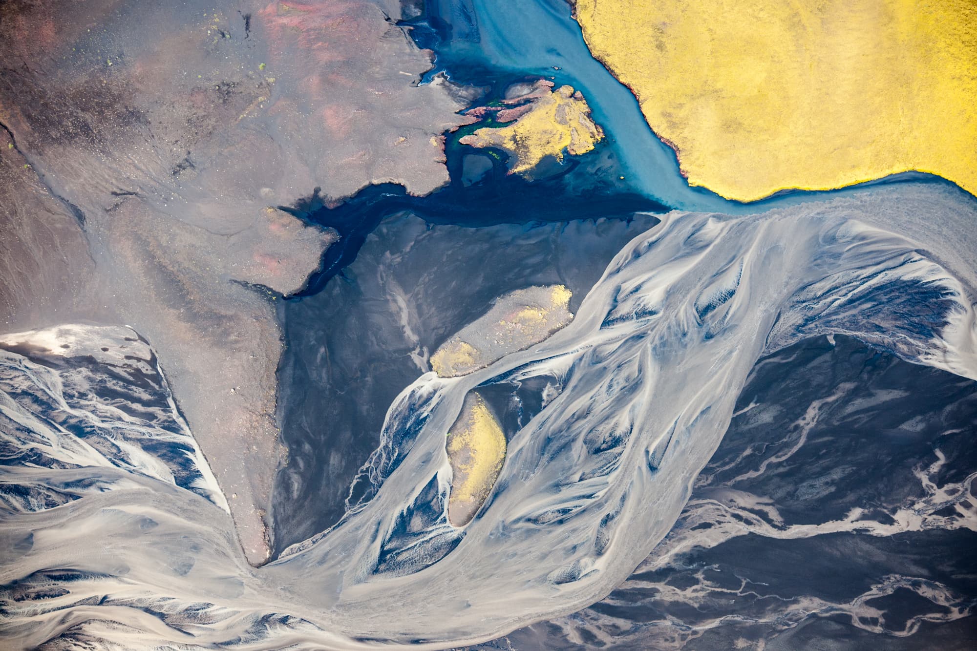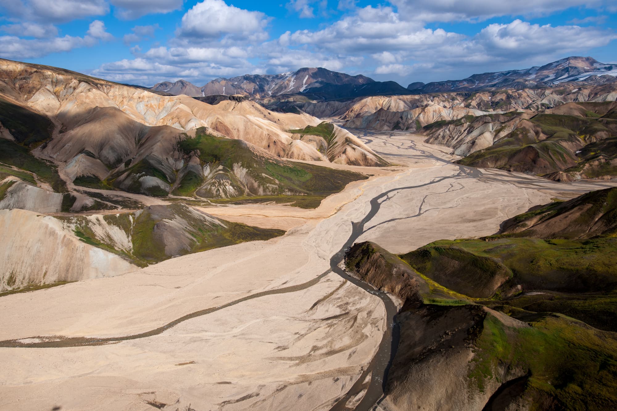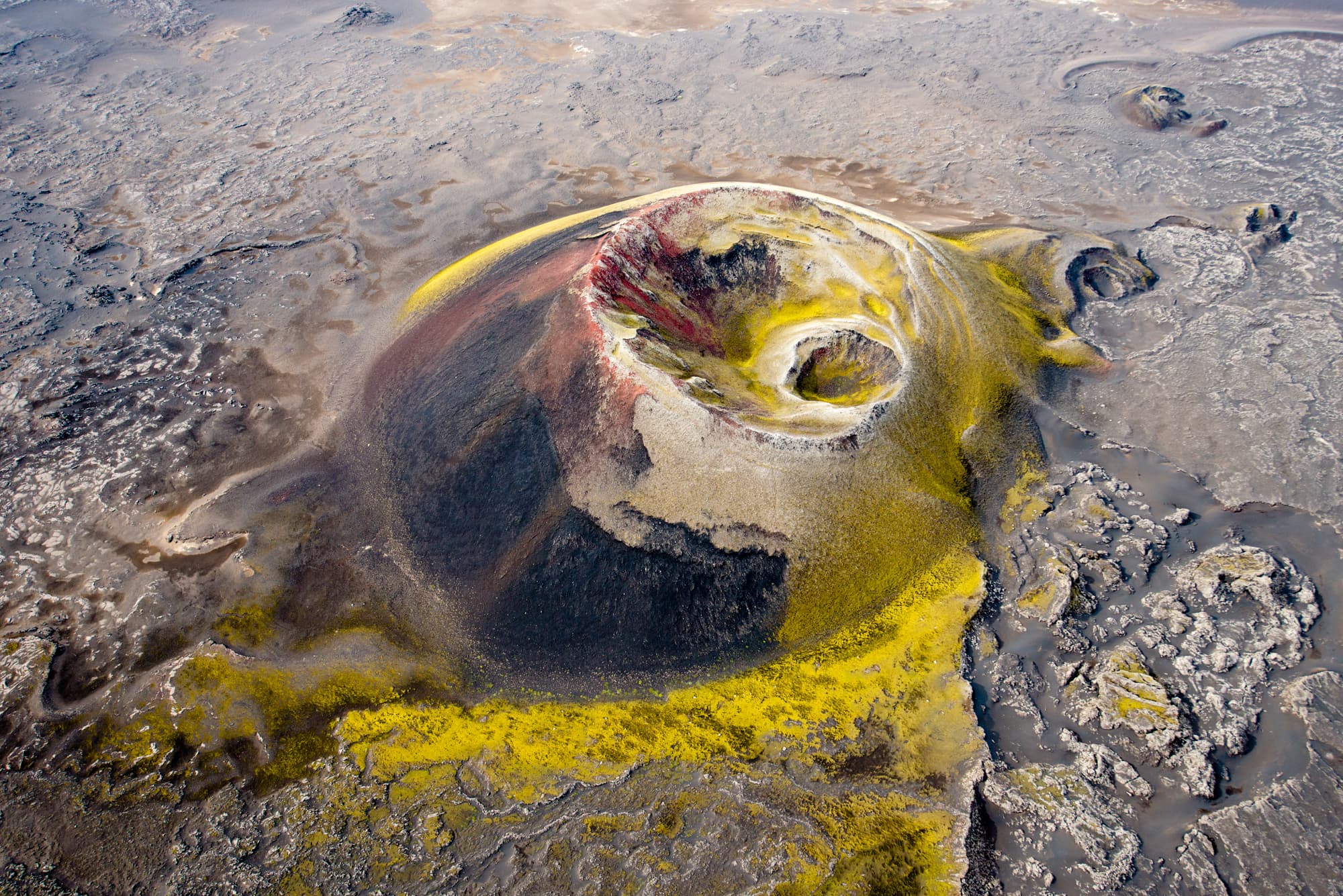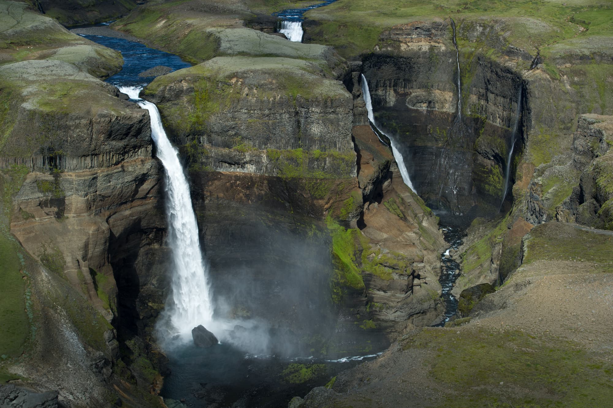 As we travel through the highlands, we will fly over places like Háifoss waterfall, the colourful mountains and geothermal areas at Landmannalaugar and the crater lakes of Veiðivötn.