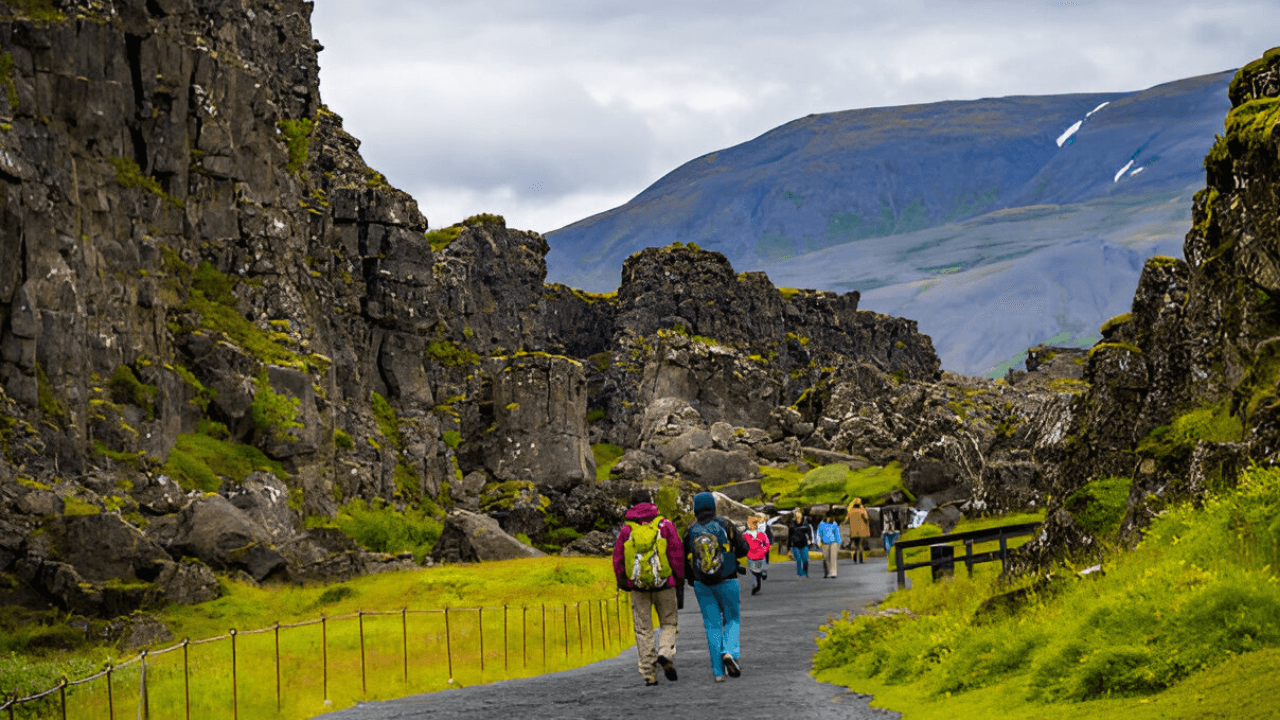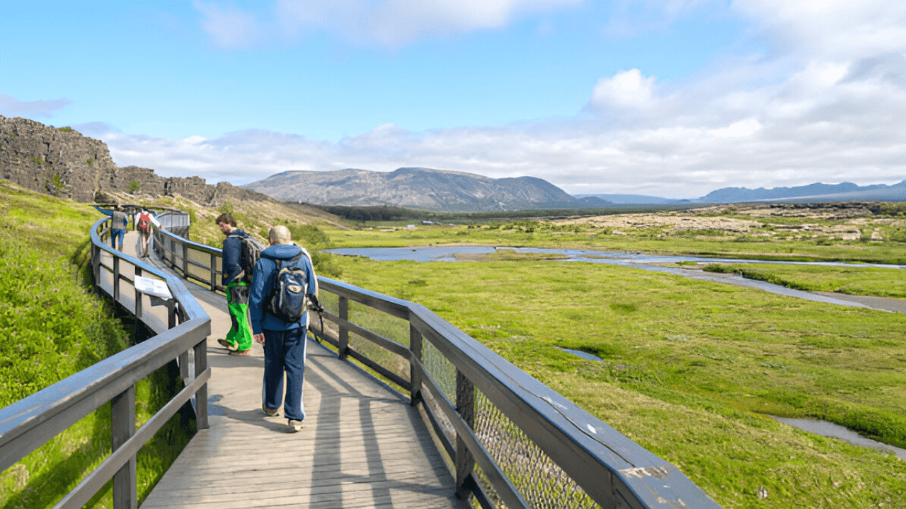 First, we'll go to Þingvellir National Park. It's a very important place where you can walk between two continents! Your guide will tell you stories about old Icelandic meetings that happened there.