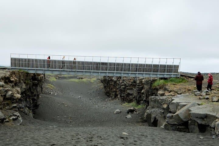 The Bridge between continents Bridge between Europe and North America on Reykjanes Peninsula. The lava-scarred Reykjanes peninsula lies on one of the world’s major plate boundaries, the Mid Atlantic Ridge. According to the continental drift theory the Eurasian and North American tectonic plates are continuously drifting apart with great forces under the gaping rifts. As the plates diverge, linear fractures, known as fissures form due to stresses created by the tension that builds up as the plates move away from each other. The Bridge between two continents at Sandvík is a small footbridge over a major fissure which provides clear evidence of the presence of a diverging plate margin. The bridge was built as a symbol for the connection between Europe and North America.